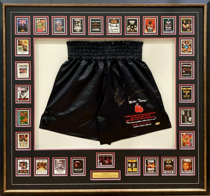 MIKE TYSON Signed Trunks & Fight Cards Display