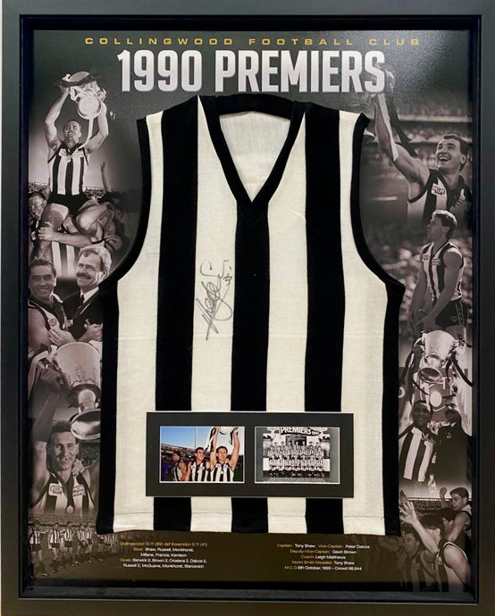 PETER DAICOS & TONY SHAW “1990 Premiers” Signed Collingwood Jumper Display