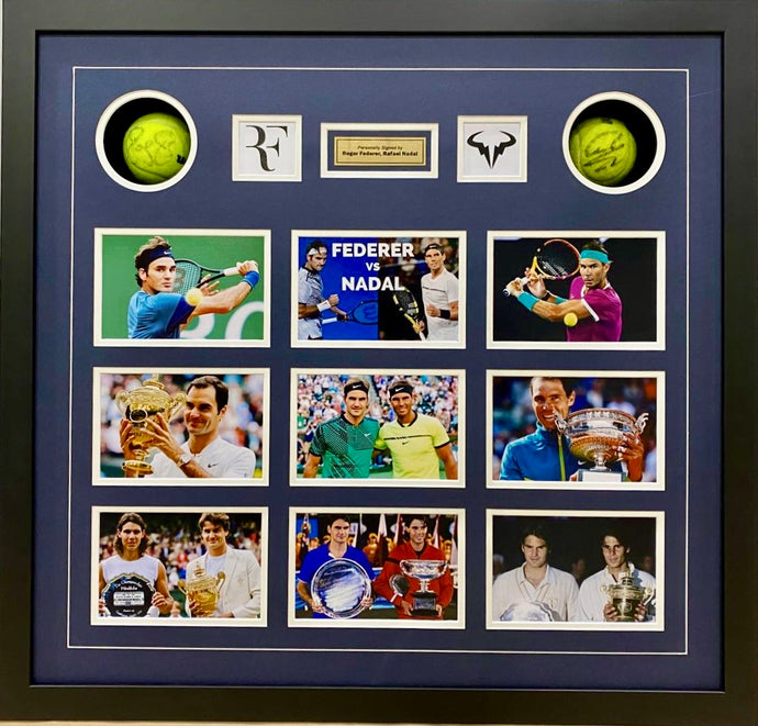 ROGER FEDERER & RAFAEL NADAL Signed Tennis Balls & Photo Collage Display