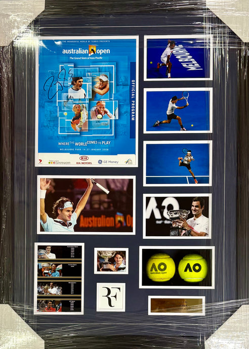 ROGER FEDERER Signed 2008 Australian Open Program & Photo/Ball Collage Display