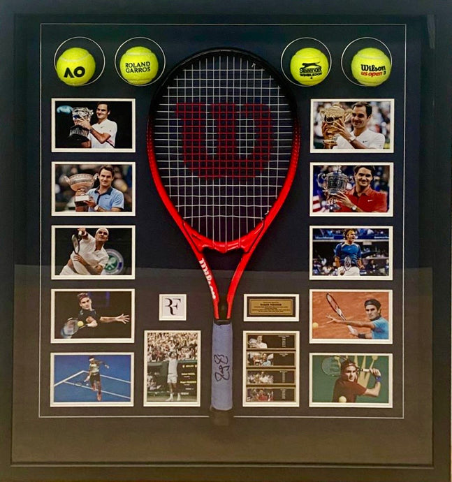 ROGER FEDERER Signed Tennis Racquet & Photos/Balls Collage Display