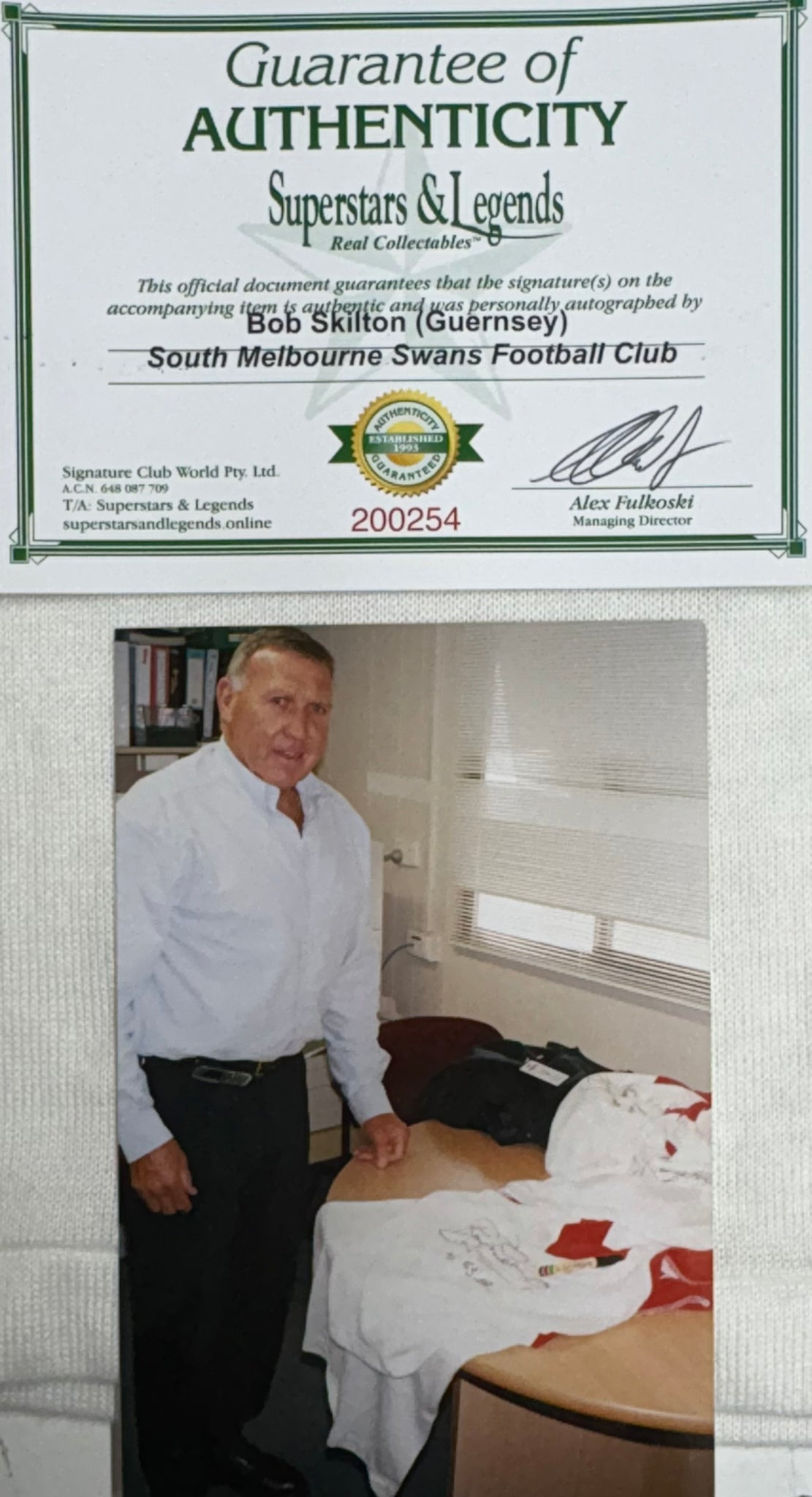 BOB SKILTON South Melbourne Swans Football Club “3-Time Brownlow Medallist 1959, 1963, 1968” Signed Jumper/Guernsey (Vintage wool style), Unframed.