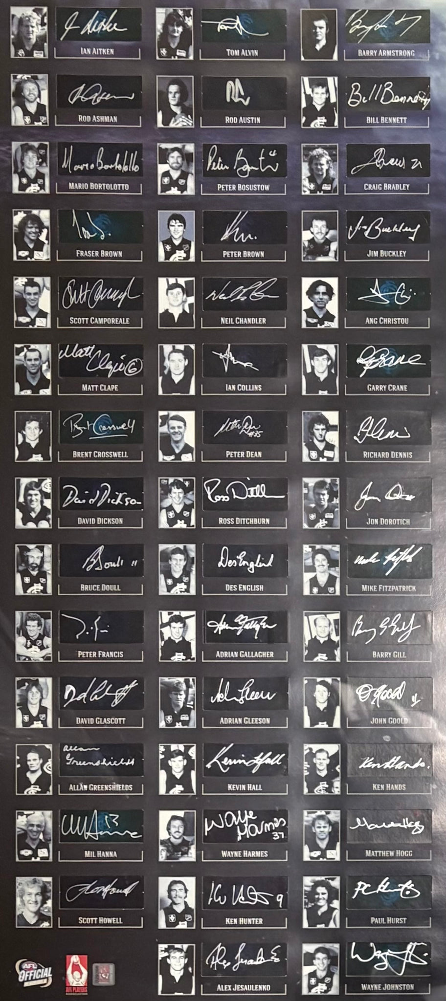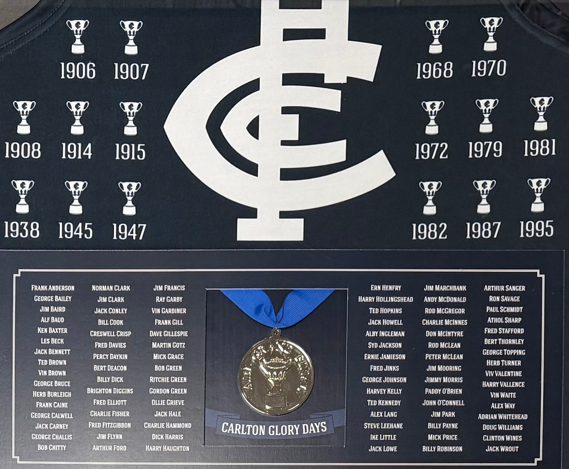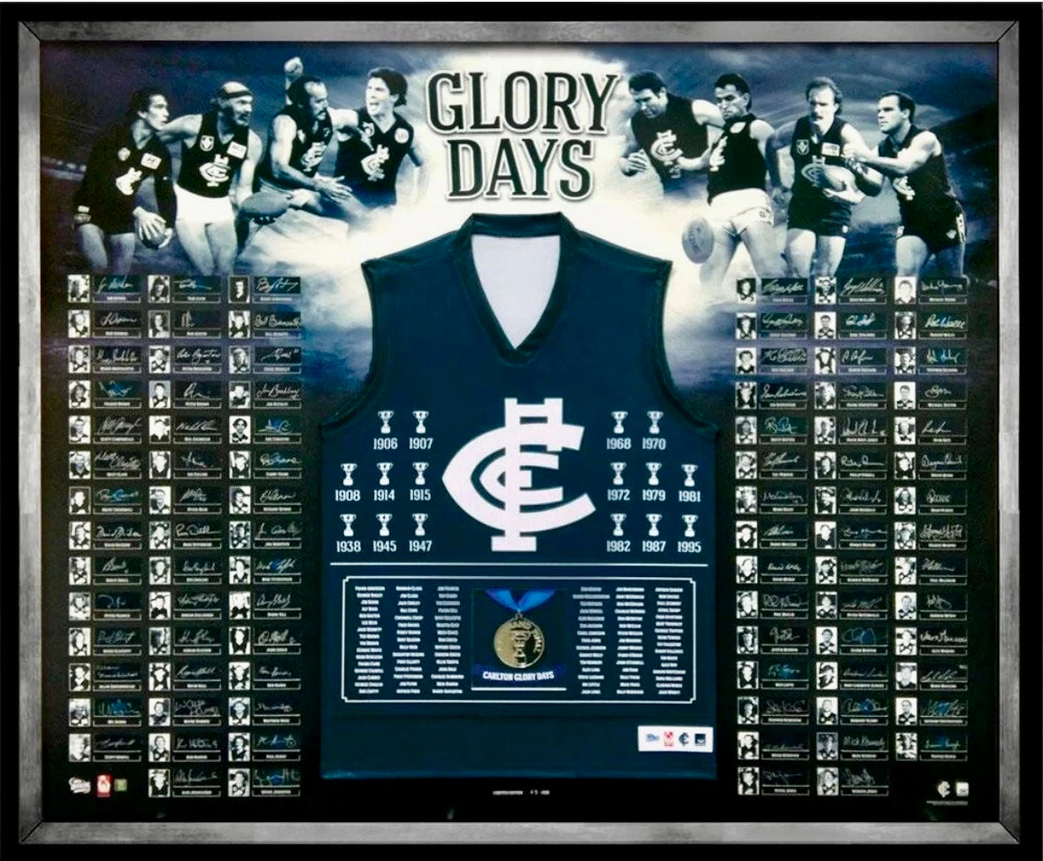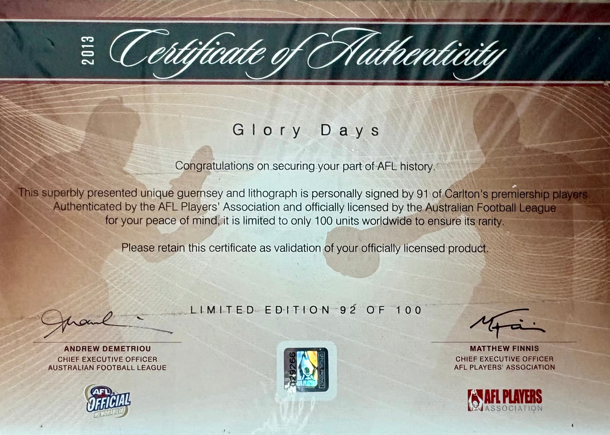 Unparalleled in its prestige, 'Glory Days' is the comprehensive, definitive premiership tribute. 'Glory Days' lists every single premiership player in Carlton's history, and is personally signed by no less than 88 living premiership players. 'Glory Days' is limited to only 100 units worldwide to ensure its rarity.