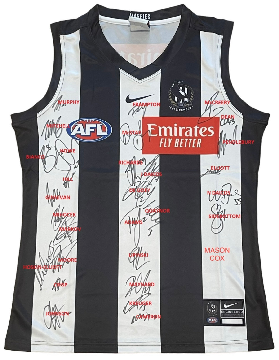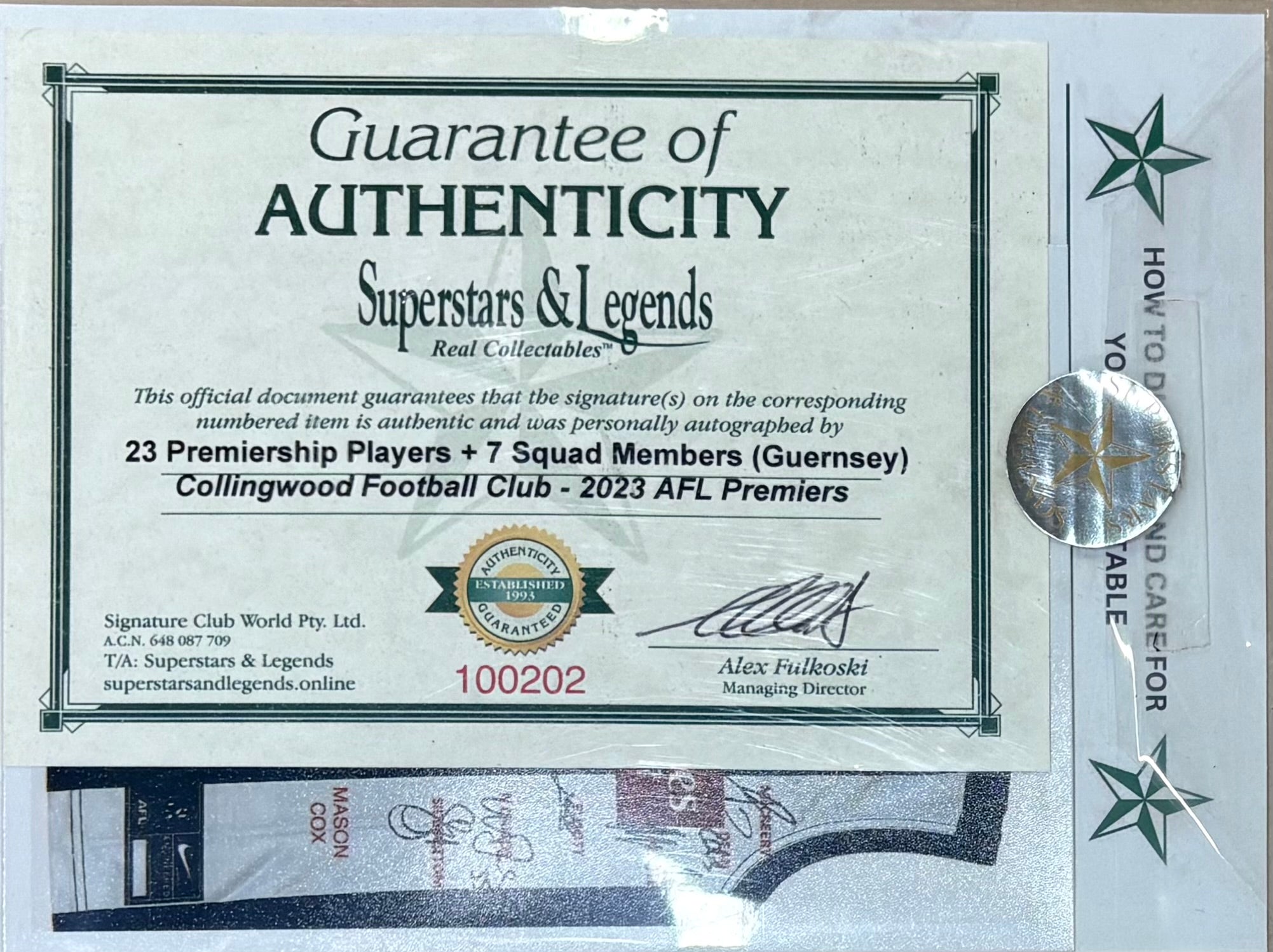 COLLINGWOOD “2023 AFL PREMIERS” Team Signed Guernsey (Signed by 30 players including the 23 Premiership Players), with Official AFL 2023 Premiership Team Cards Display - FRAMED.
