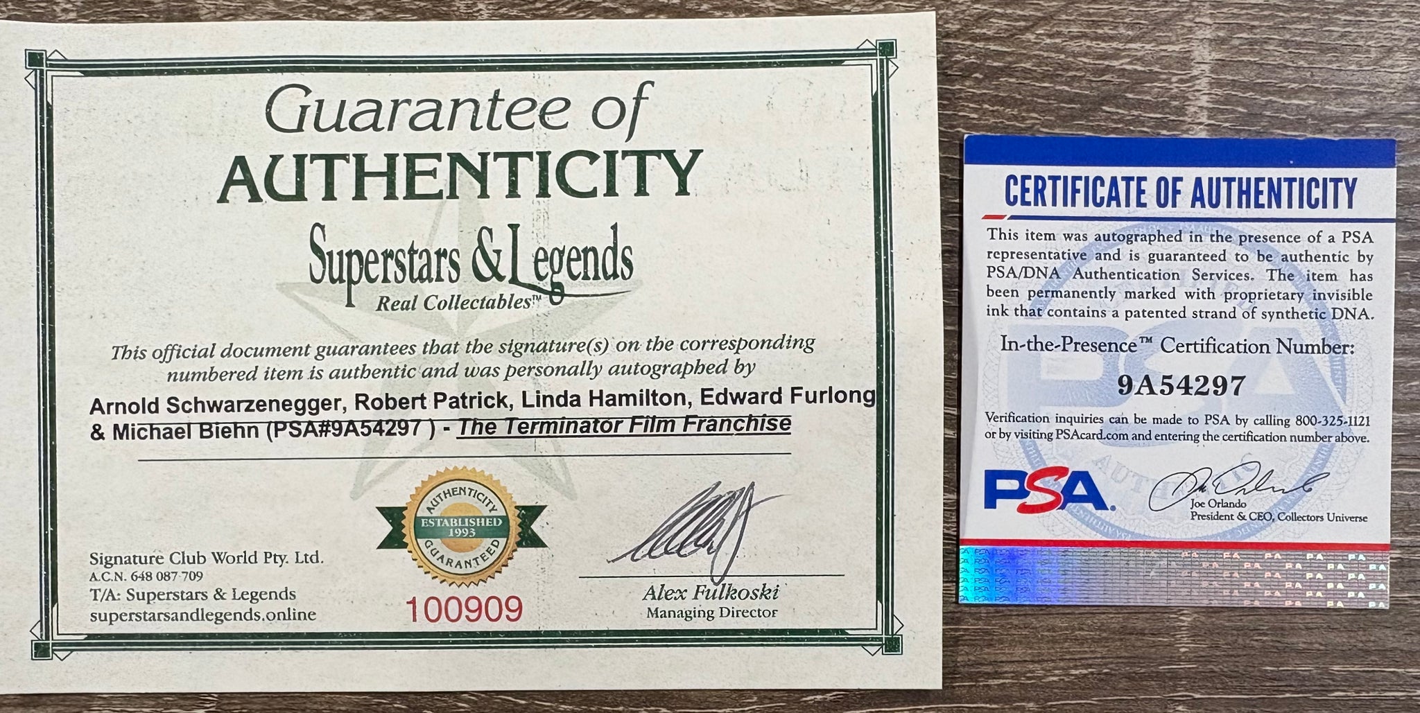 Terminator: ARNOLD SCWARZENEGGER, ROBERT PATRICK, LINDA HAMILTON, EDWARD FURLONG & MICHAEL BIEHN Signed 8”x12” Photos & 11”x17” The Terminator Poster Collage Display, Framed.