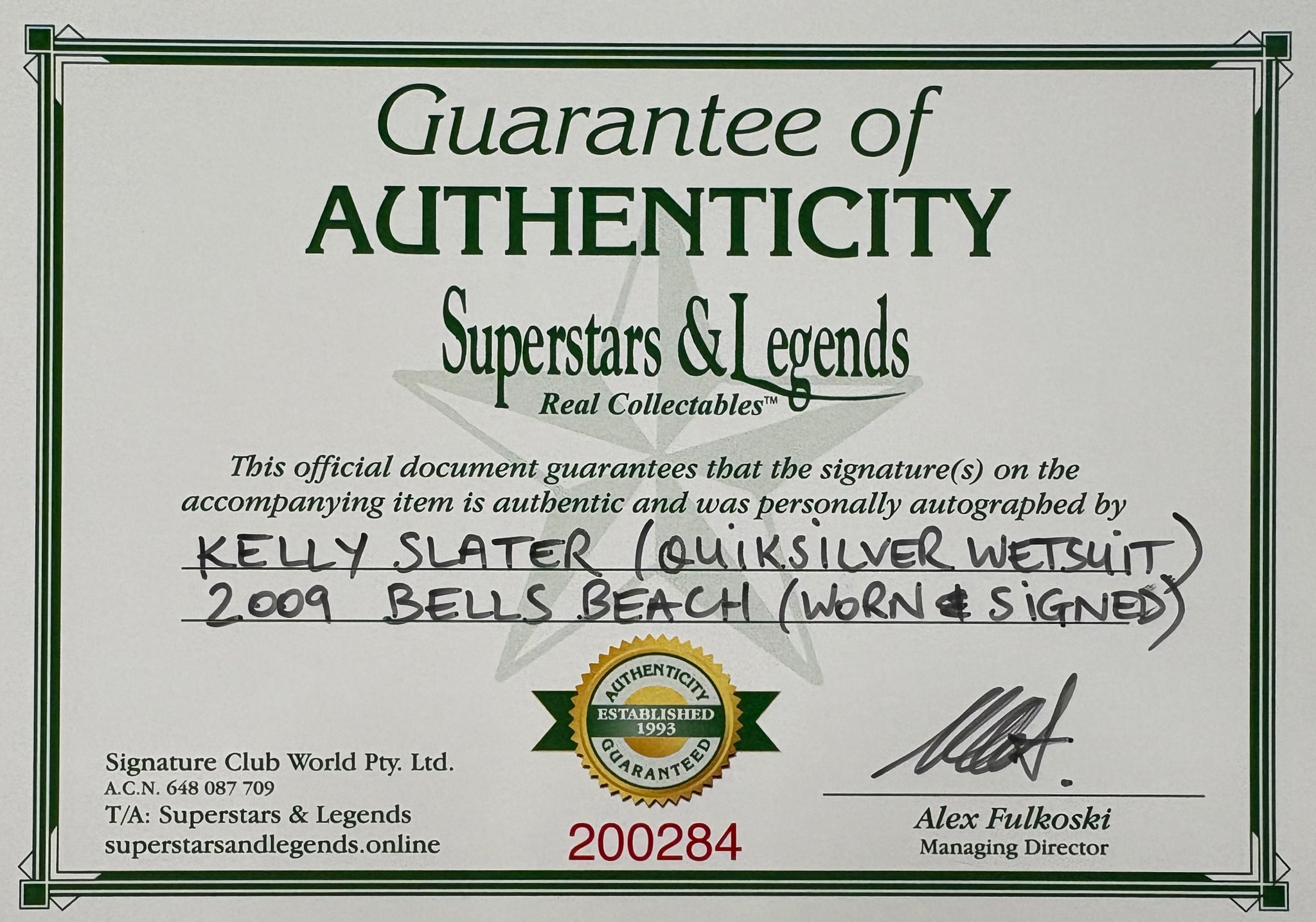 KELLY SLATER 2009 Bells Beach Competition Worn & Signed QUIKSILVER Wetsuit, UnFramed.