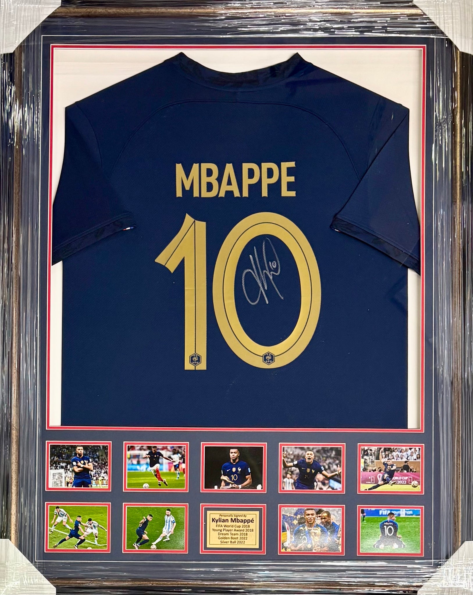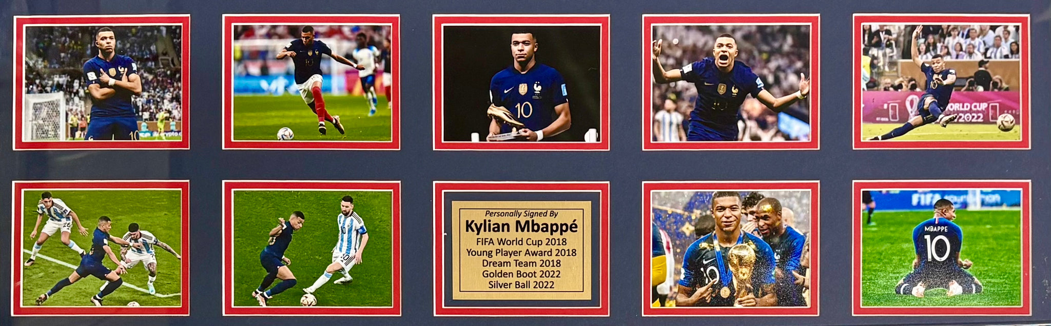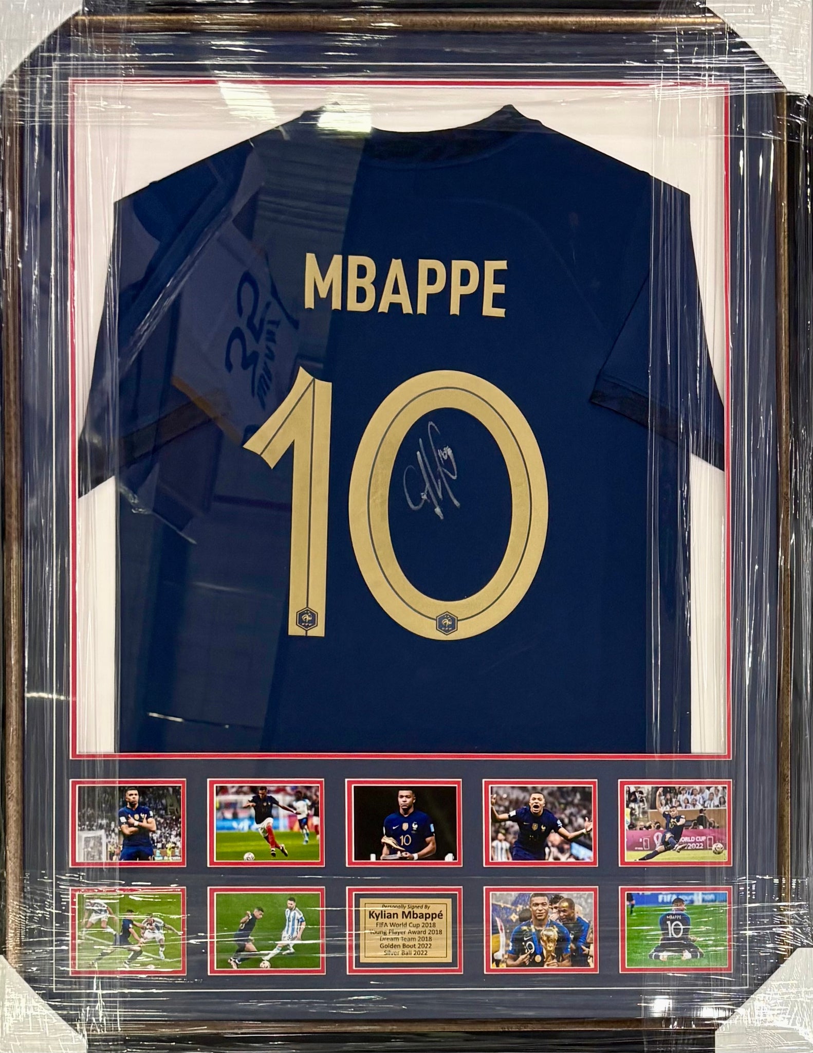 KYLIAN MBAPPE “2018 & 2022 World Cup” Signed France Jersey & Photo Collage Display, Framed.