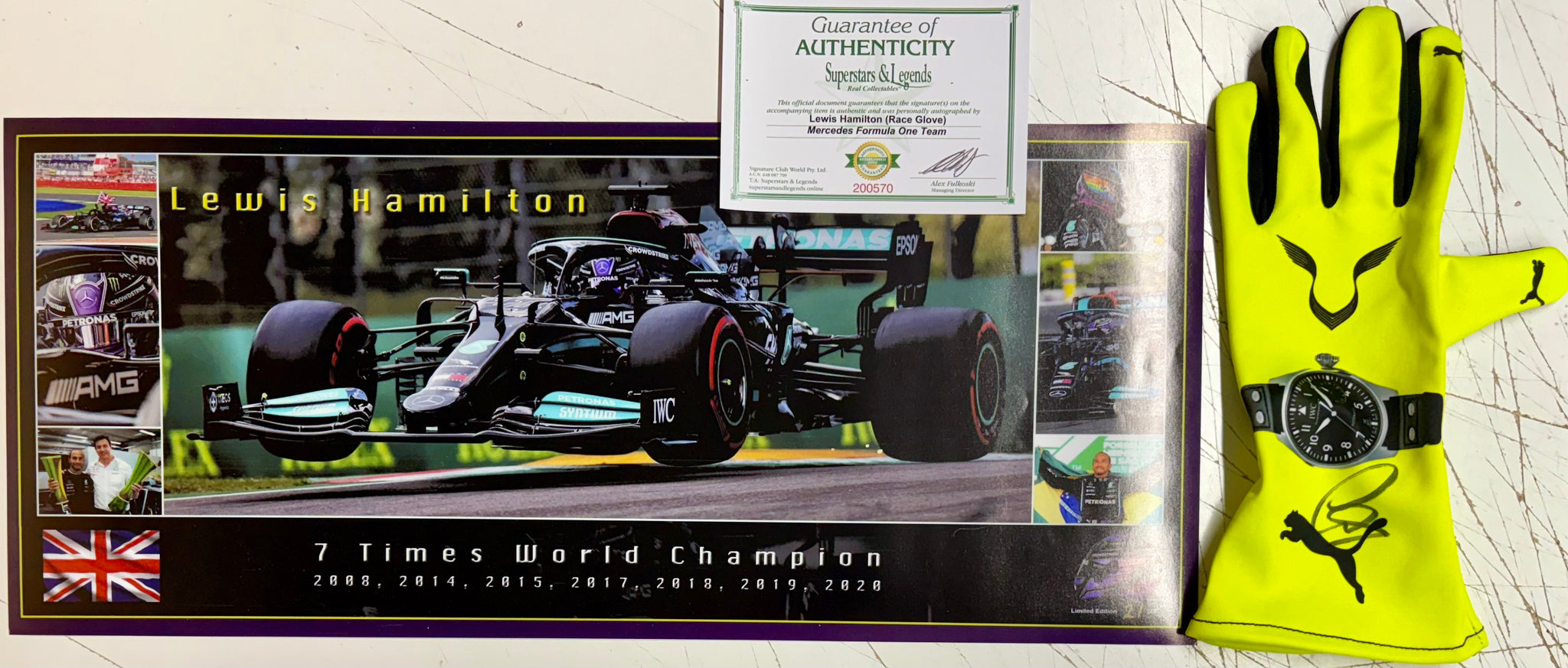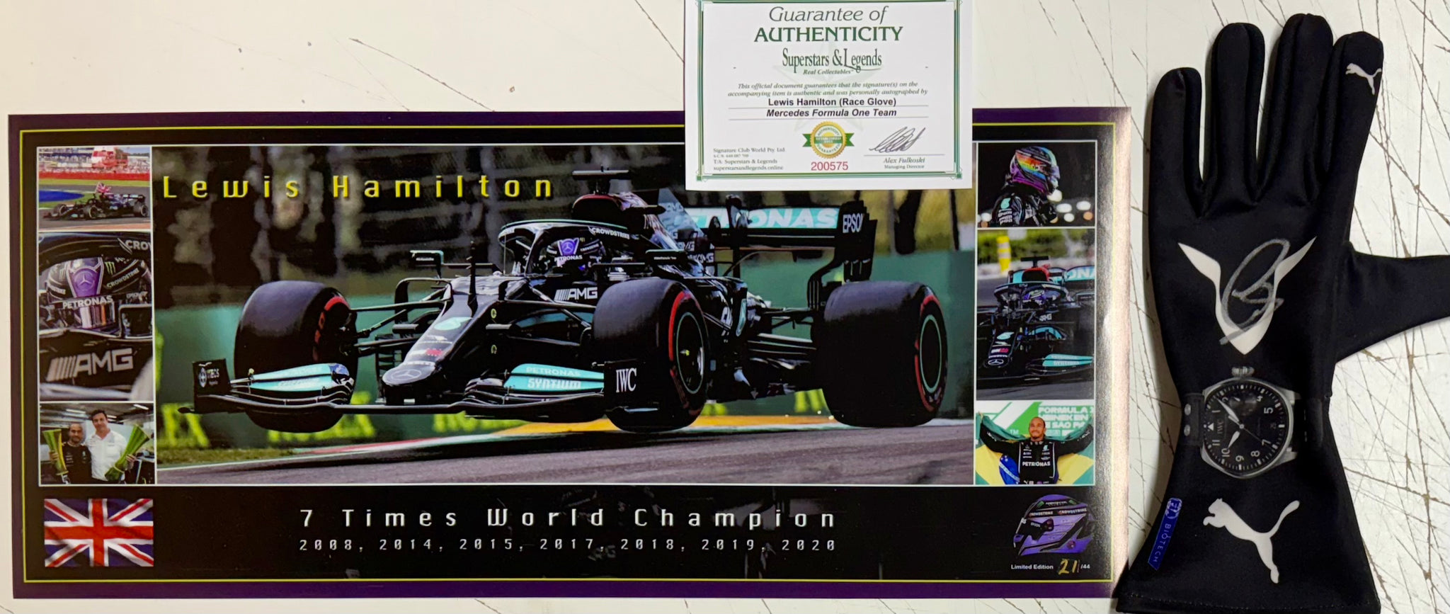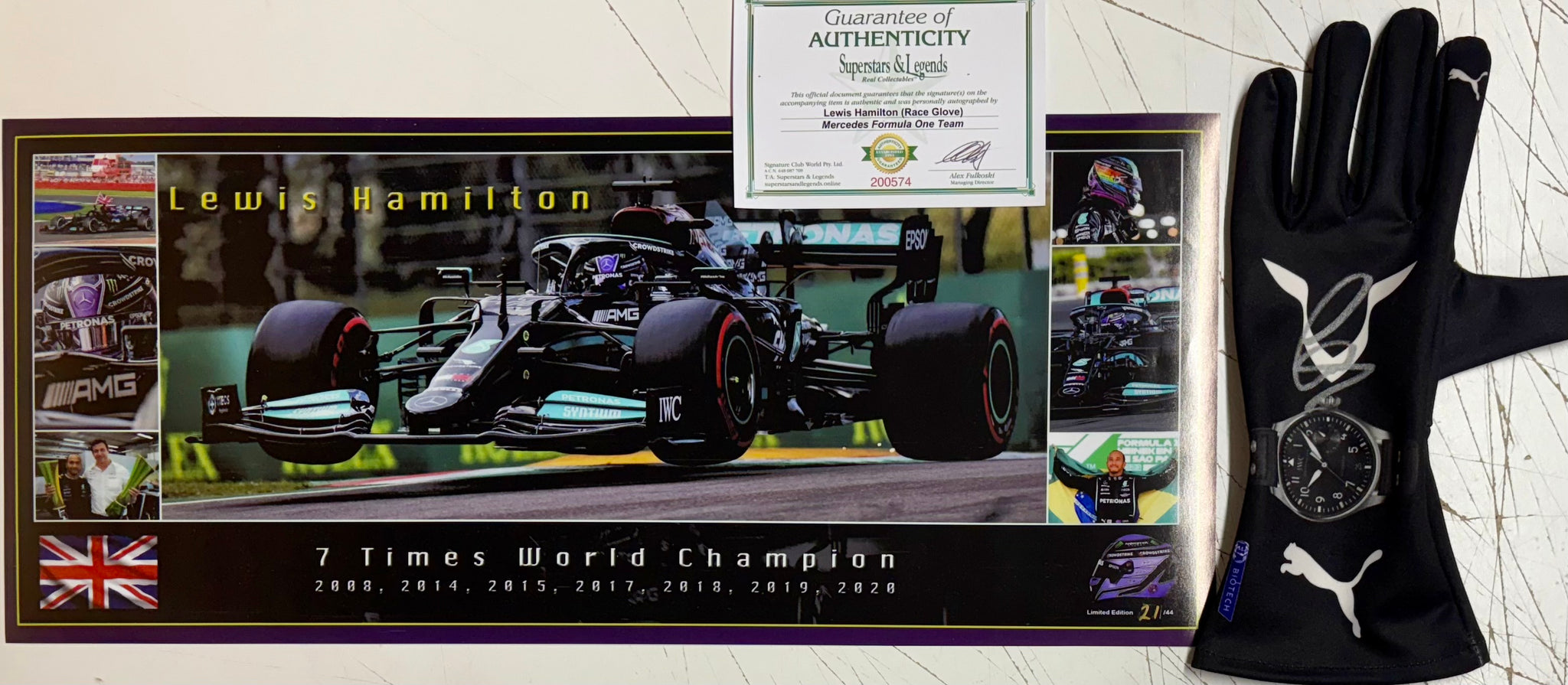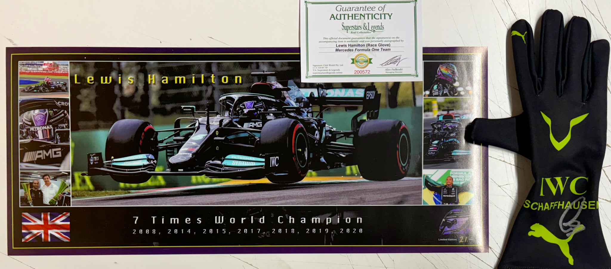 LEWIS HAMILTON “F1 Mercedes" Signed replica Race Glove & 7-Time F1 Championship Limited Edition Panoramic Print, UnFramed.