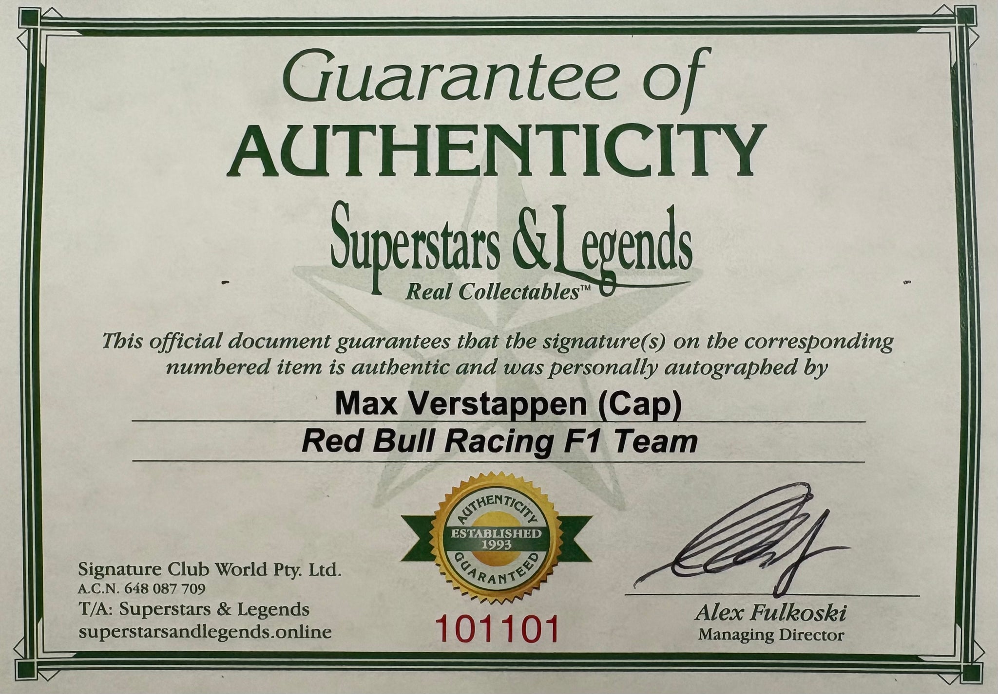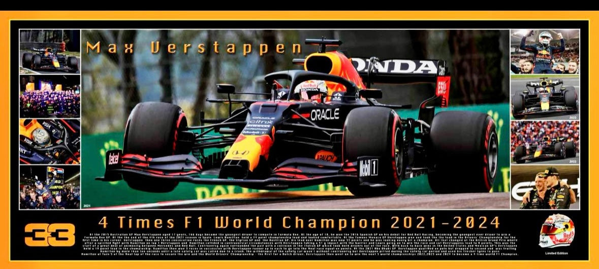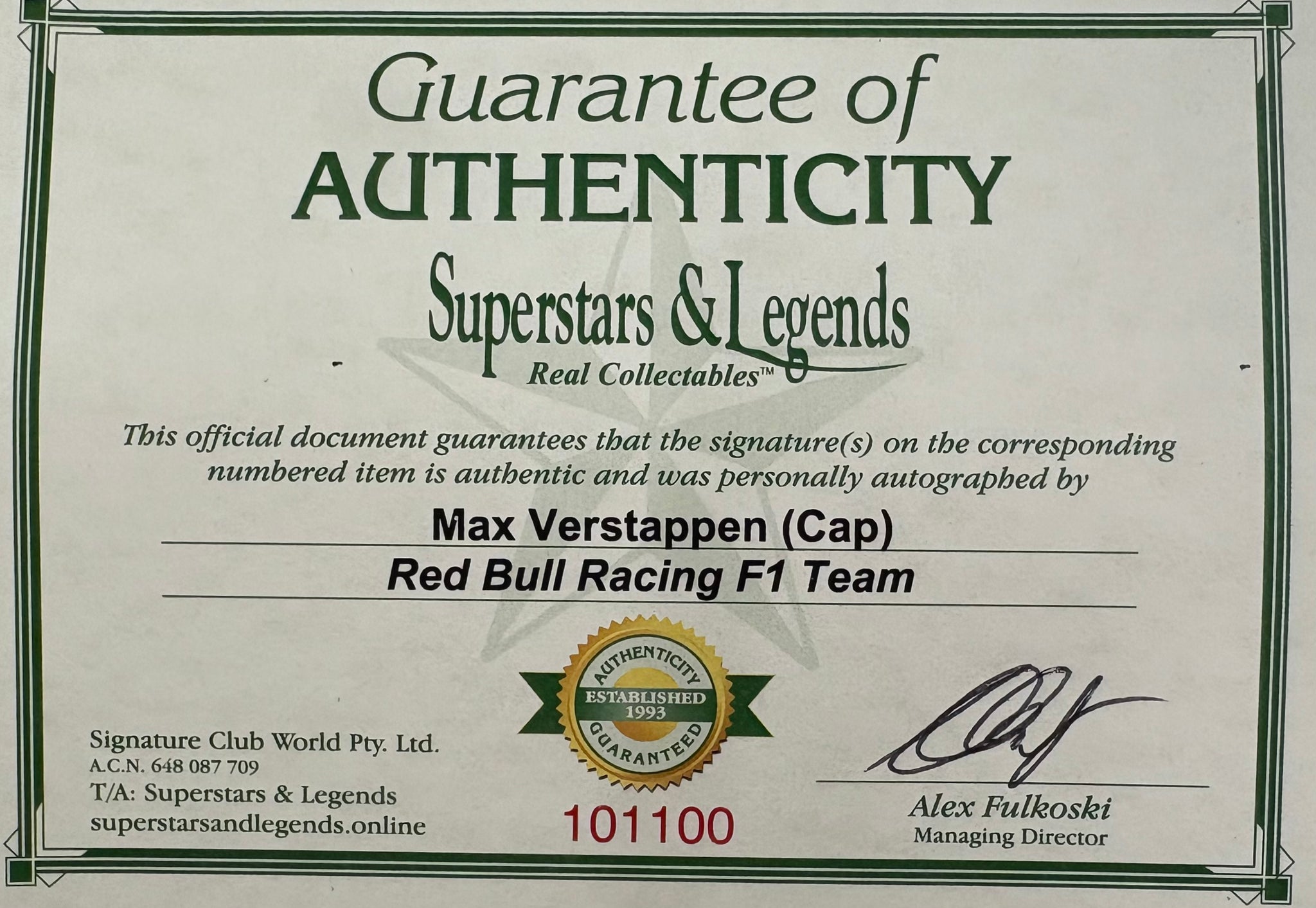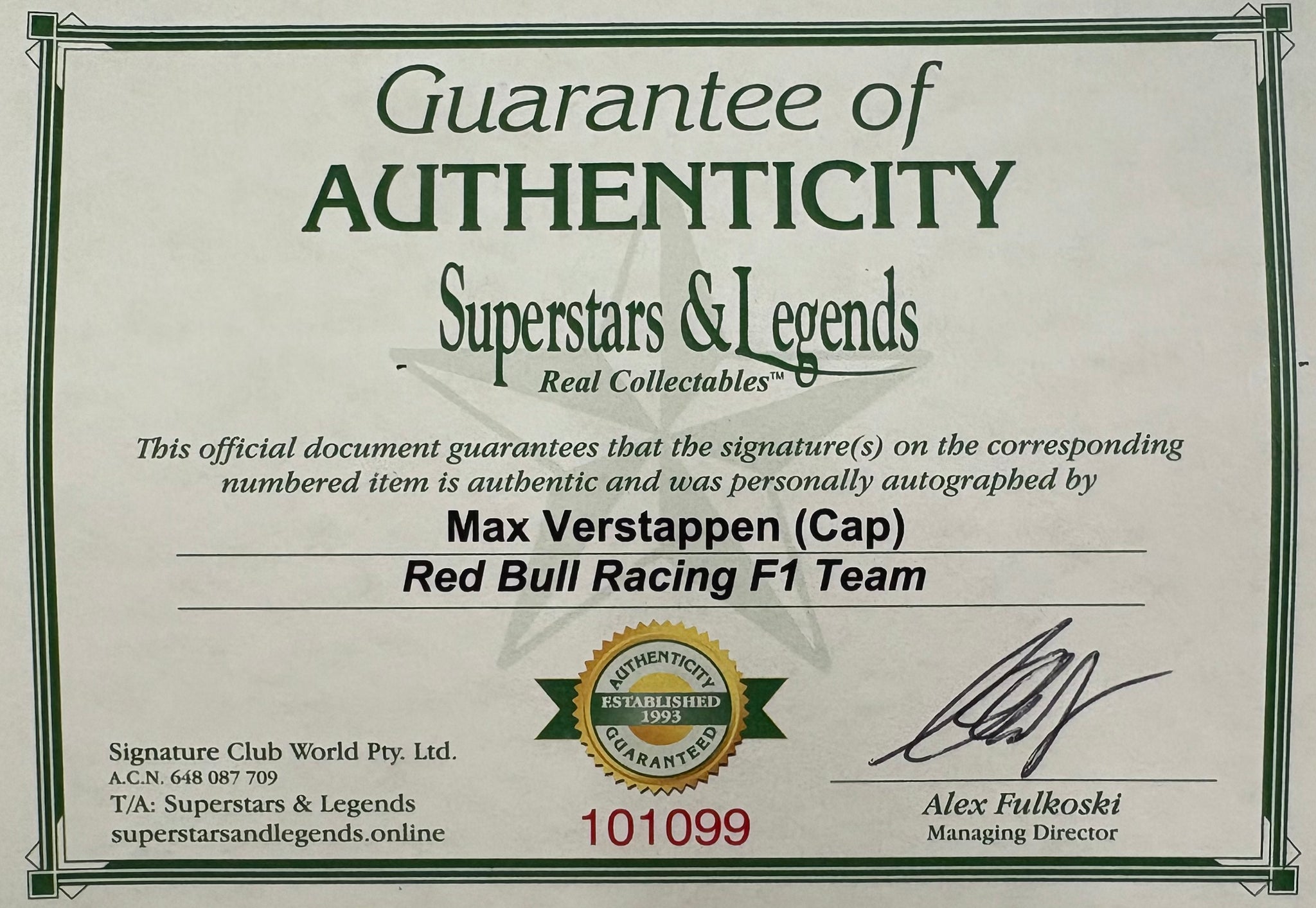 MAX VERSTAPPEN Signed F1 Red Bull Racing Cap & 4-Time F1 World Champion Panoramic Print Display, Box Framed.