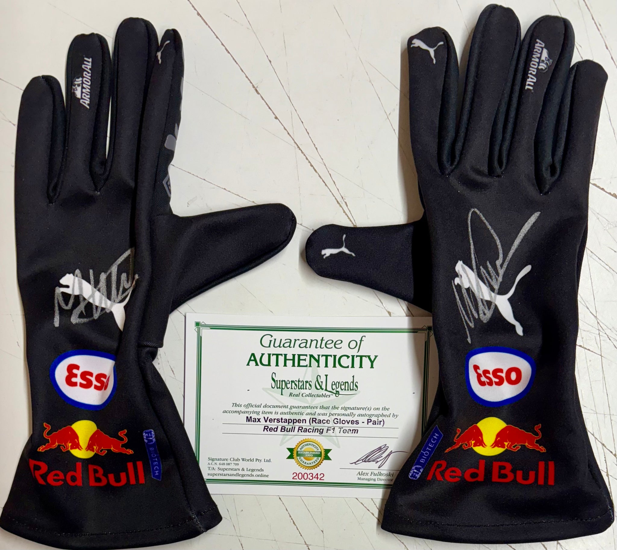 MAX VERSTAPPEN Signed Pair of F1 Red Bull Racing Gloves (Both Gloves Signed) & 4x World Champion Panoramic Print, UnFramed.