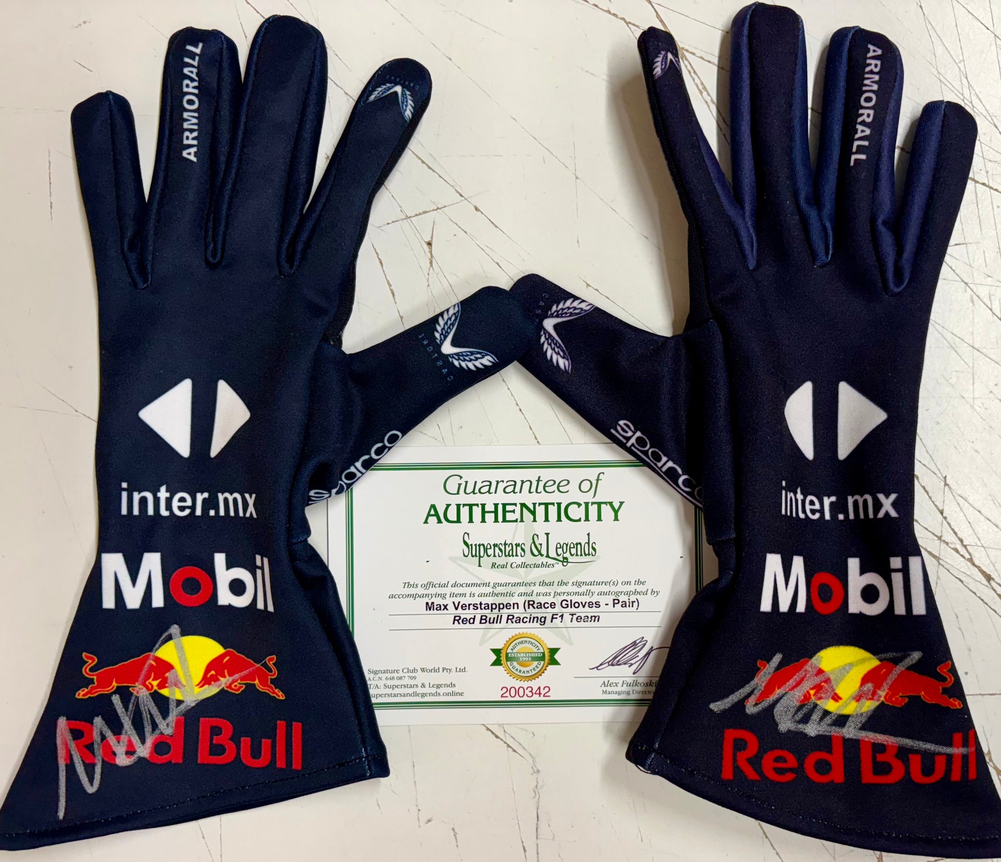MAX VERSTAPPEN Signed Pair of F1 Red Bull Racing Gloves (Both Gloves Signed) & 2021 World Champion Panoramic Print, UnFramed.