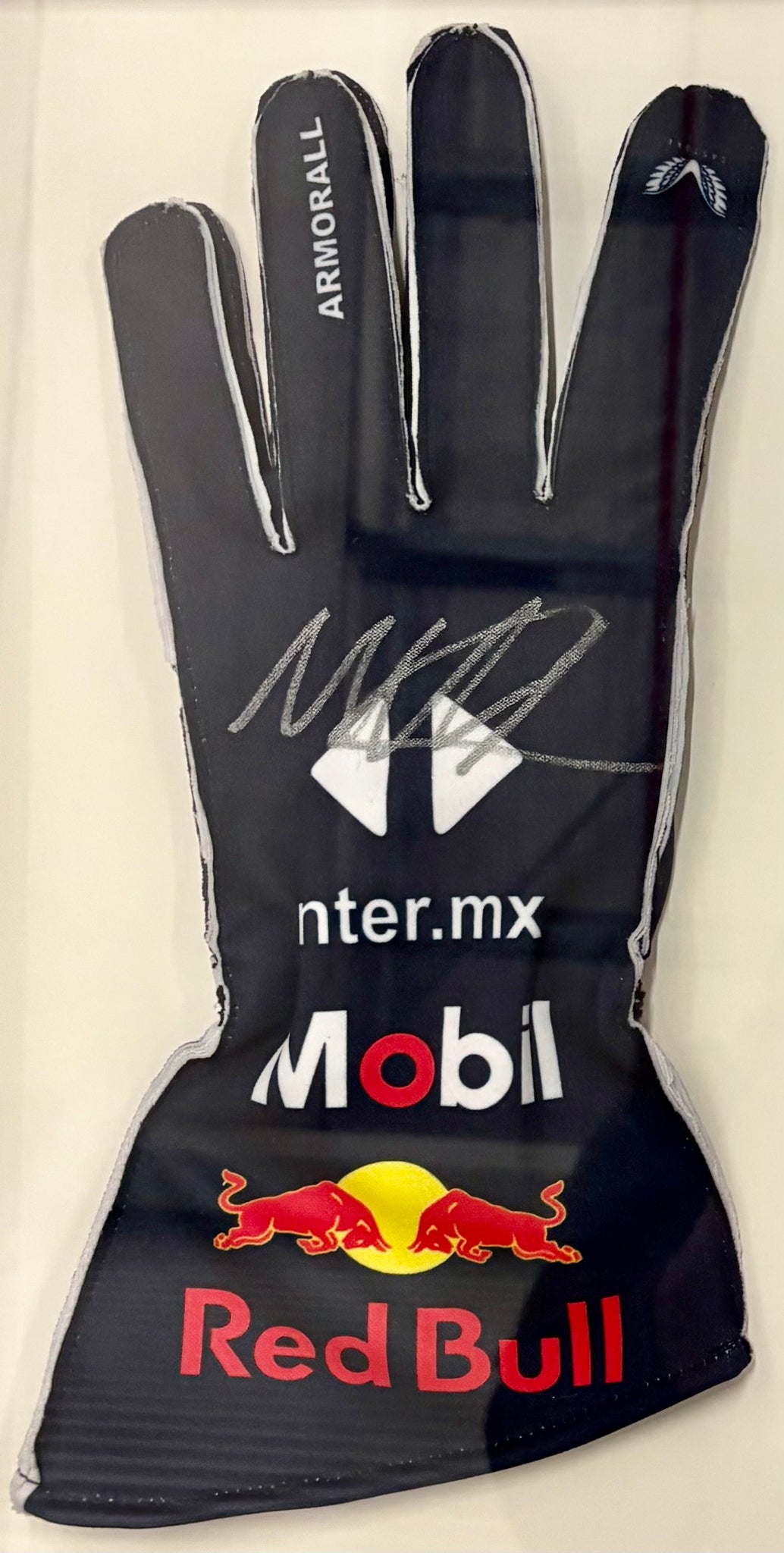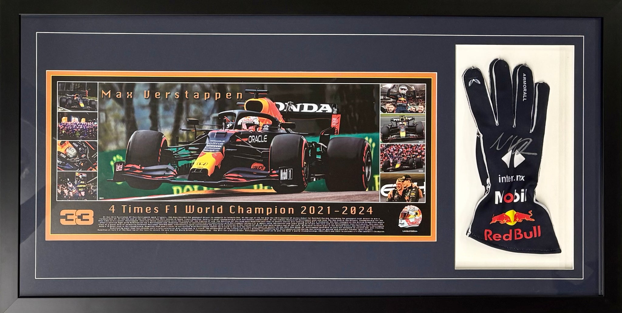 MAX VERSTAPPEN Signed F1 Red Bull Racing Glove & 4-Time F1 World Champion Panoramic Print Display, Framed.