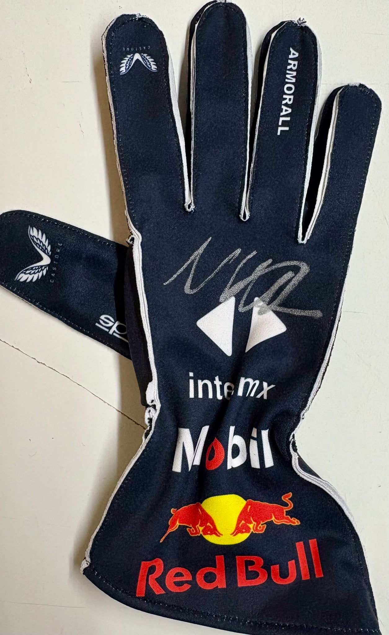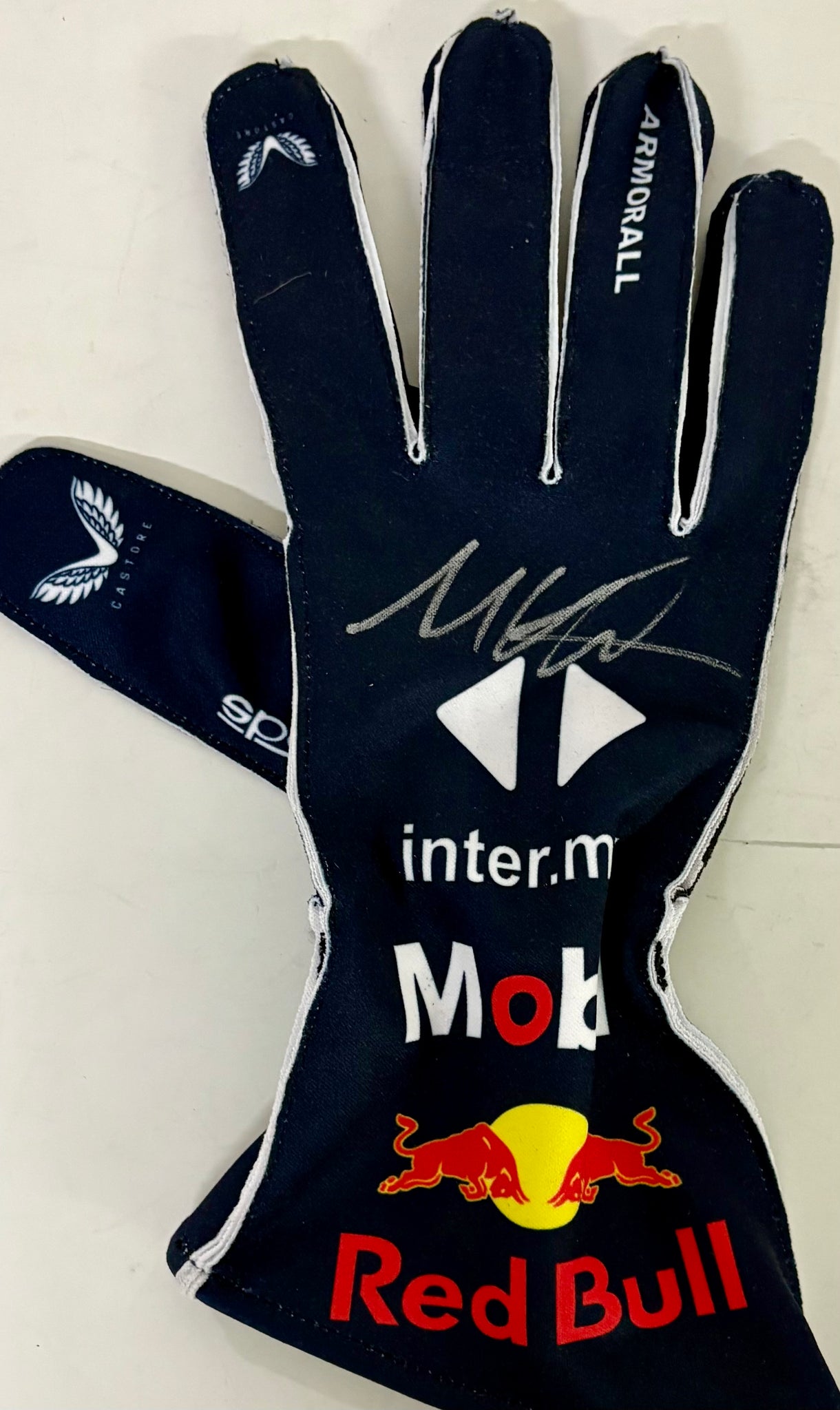 MAX VERSTAPPEN Signed F1 Red Bull Racing Glove & 2021 World Champion Panoramic Print Display, Framed.