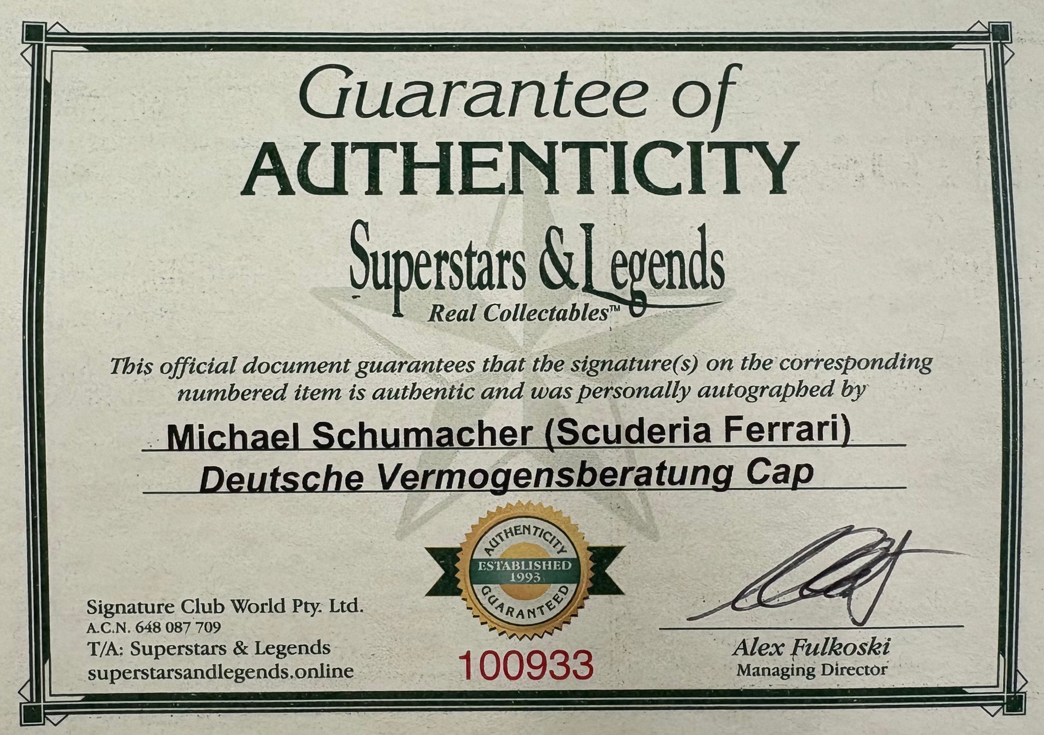 Amazing seller and fast delivery. The signed Michael Schumacher cap is even better than expected. Highly recommend.