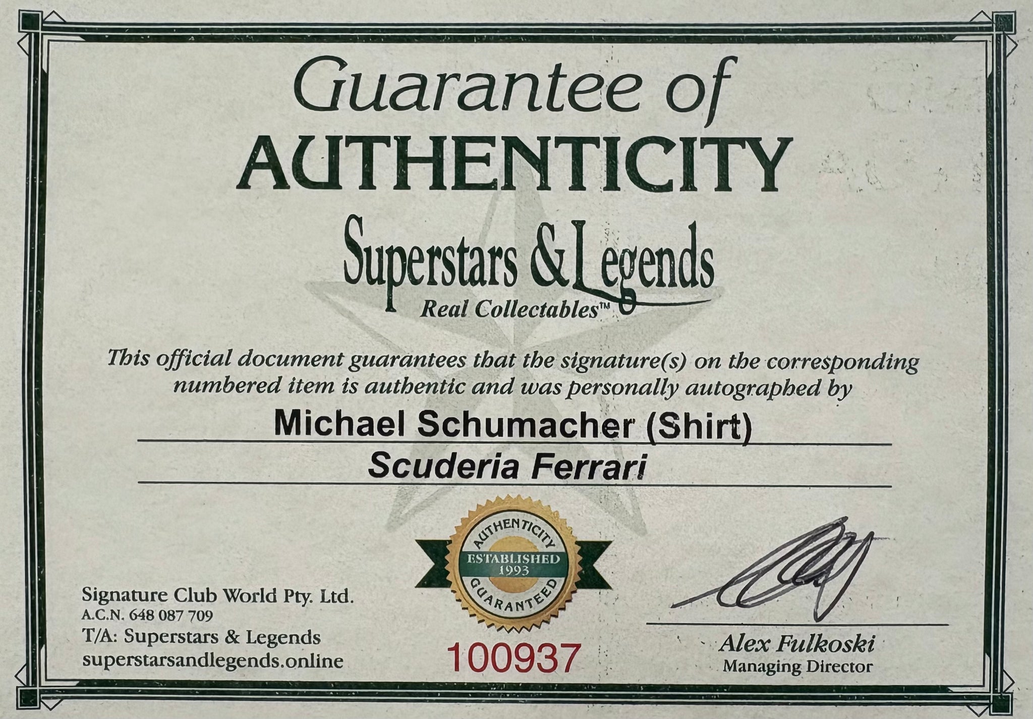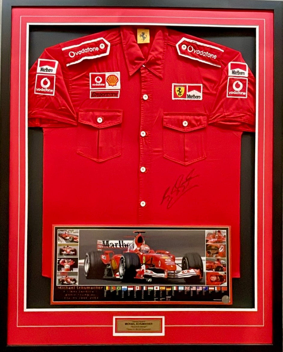 MICHAEL SCHUMACHER Signed Scuderia Ferrari Shirt & Limited Edition Panoramic Collage Print Display, Framed.