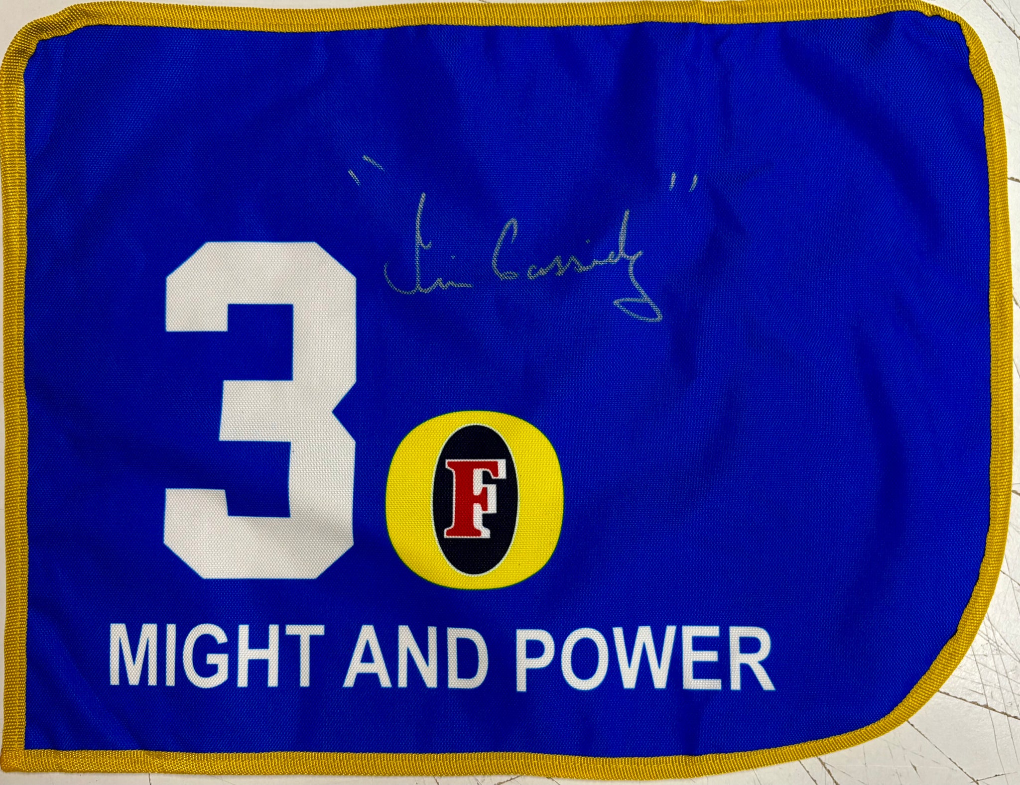 MIGHT AND POWER - Jim Cassidy (Jockey) Signed Saddle Cloth (replica) & Caulfield/Melbourne Cup Double Photo Collage Display, Framed.