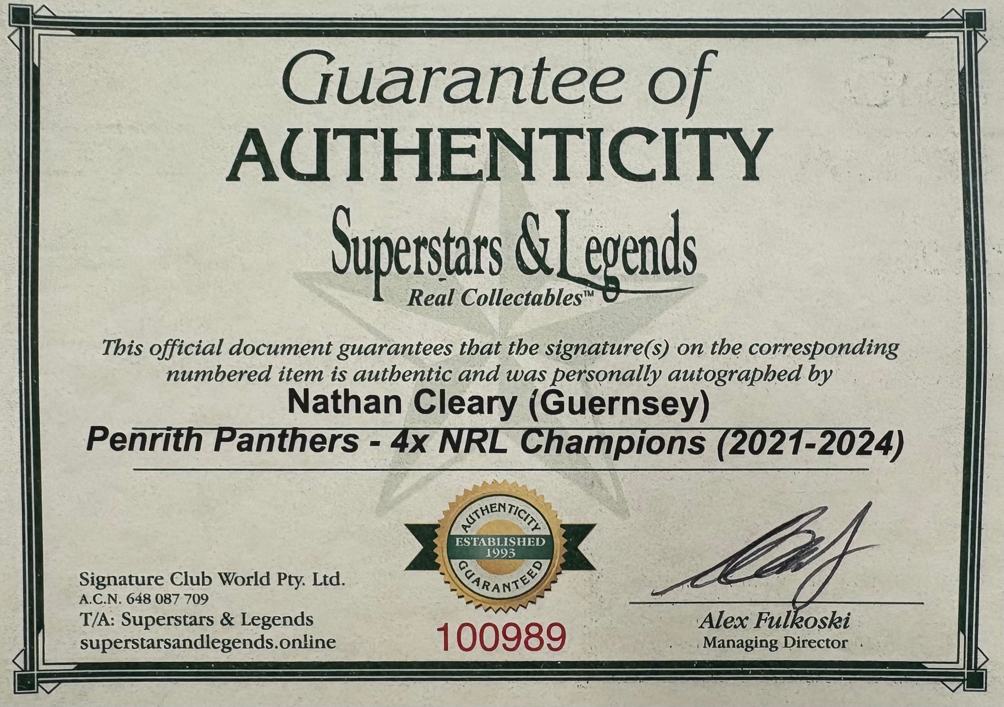 NATHAN CLEARY “2021-2024 PREMIERSHIP Player & 2x Clive Churchill Medallist” Signed Penrith Panthers Jersey/Guernsey & Photo Collage Display, Framed.