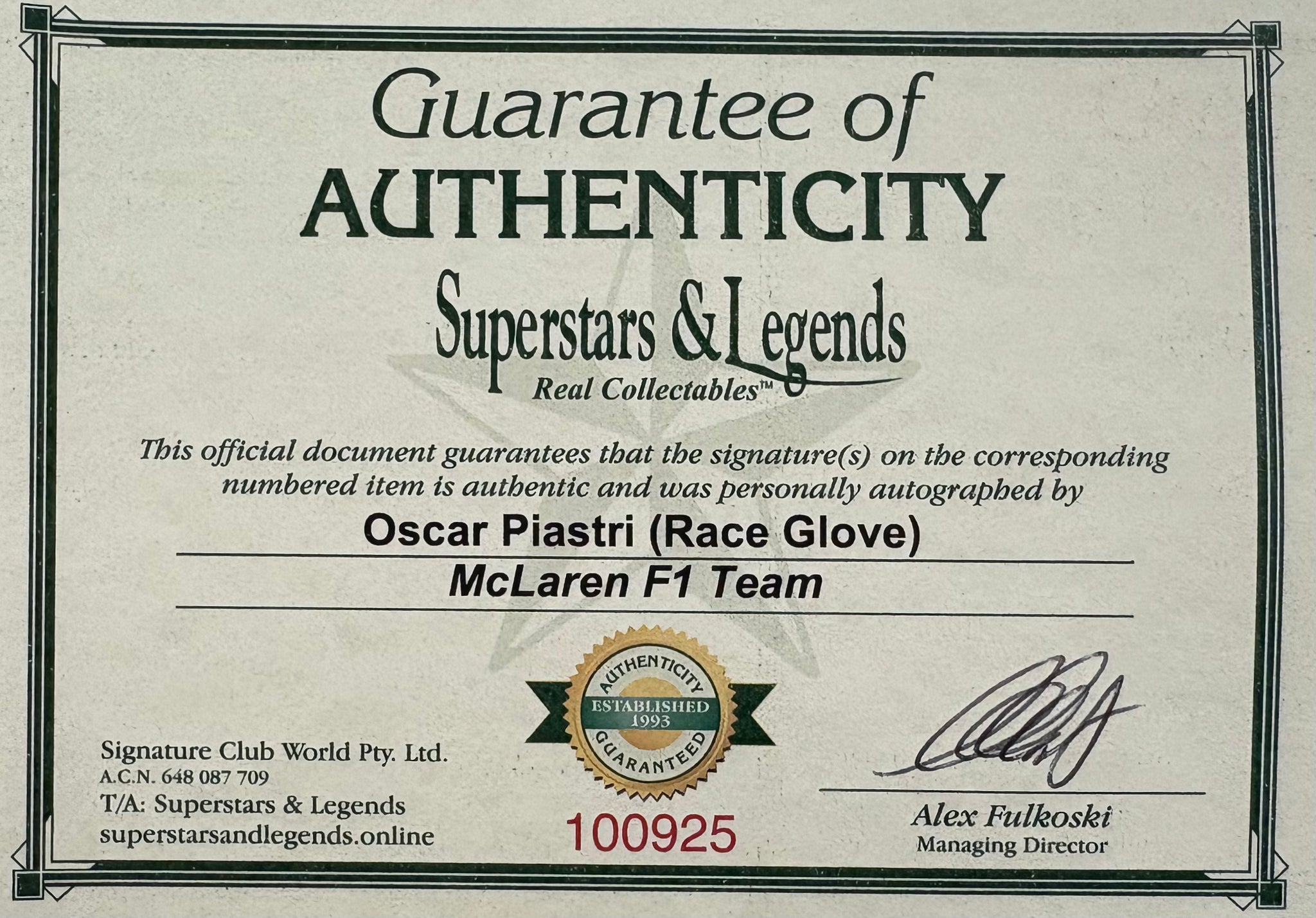 OSCAR PIASTRI Signed F1 Race Glove & “First F1 GP Win” Photo Collage Display, Box Framed.