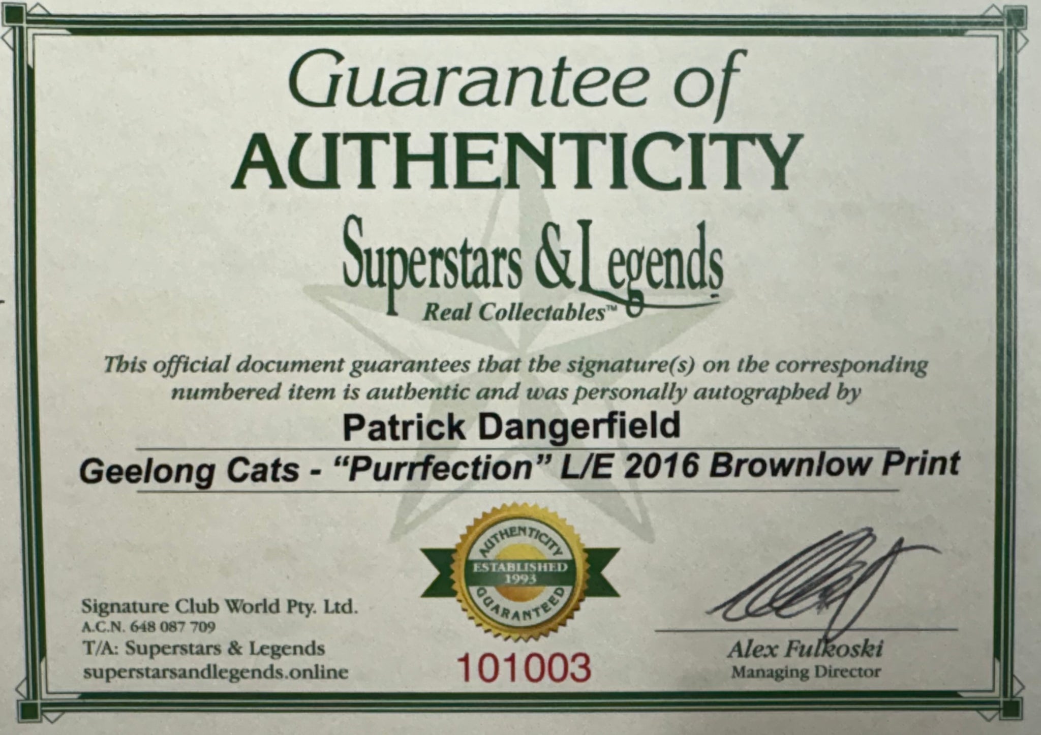 PATRICK DANGERFIELD Signed Geelong Cats “PURRFECTION” 2016 Brownlow Medallist Limited Edition Official AFL Print Display, Framed.