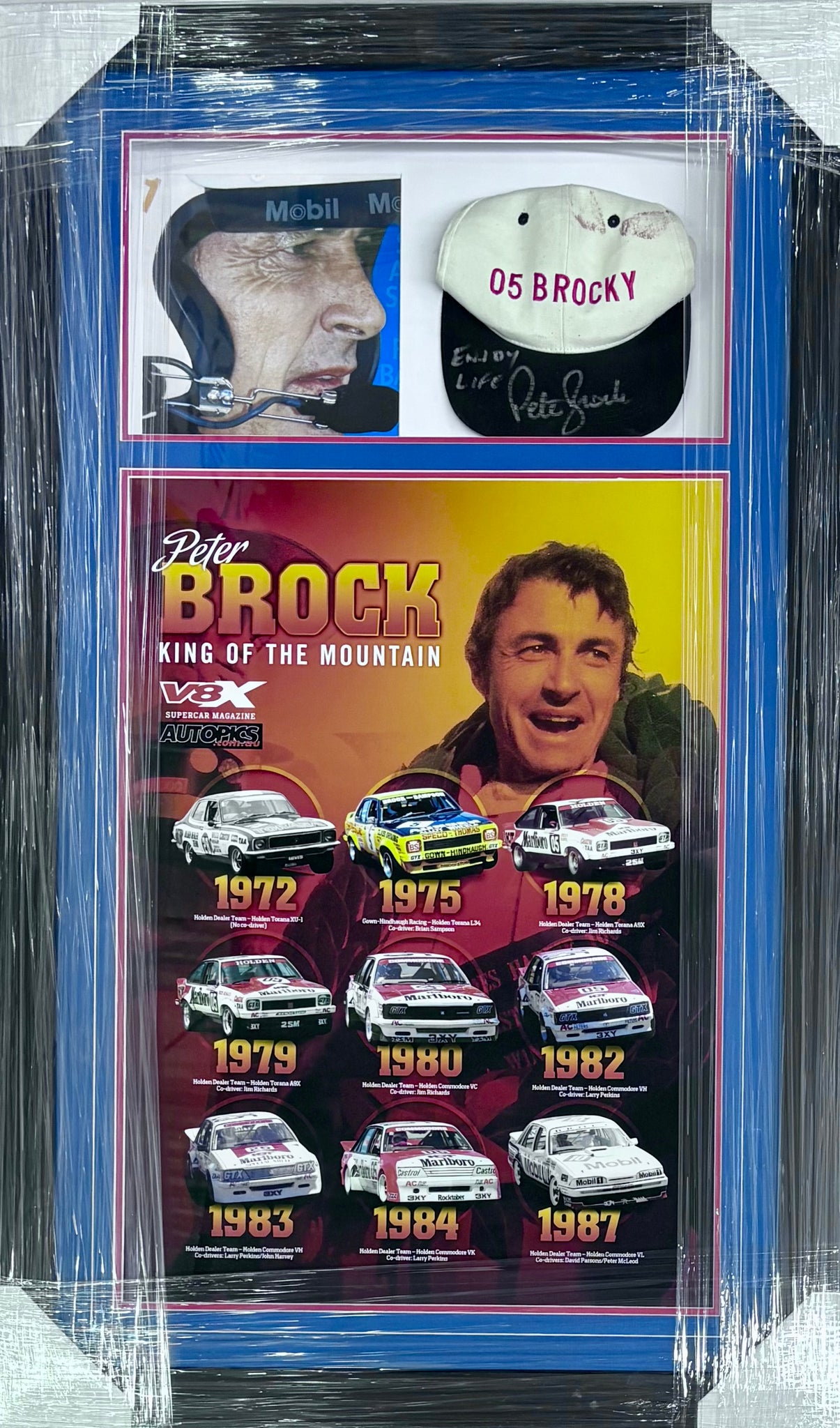 PETER BROCK Signed “05 Brocky” Cap & “King Of The Mountain” Print Display, Framed.