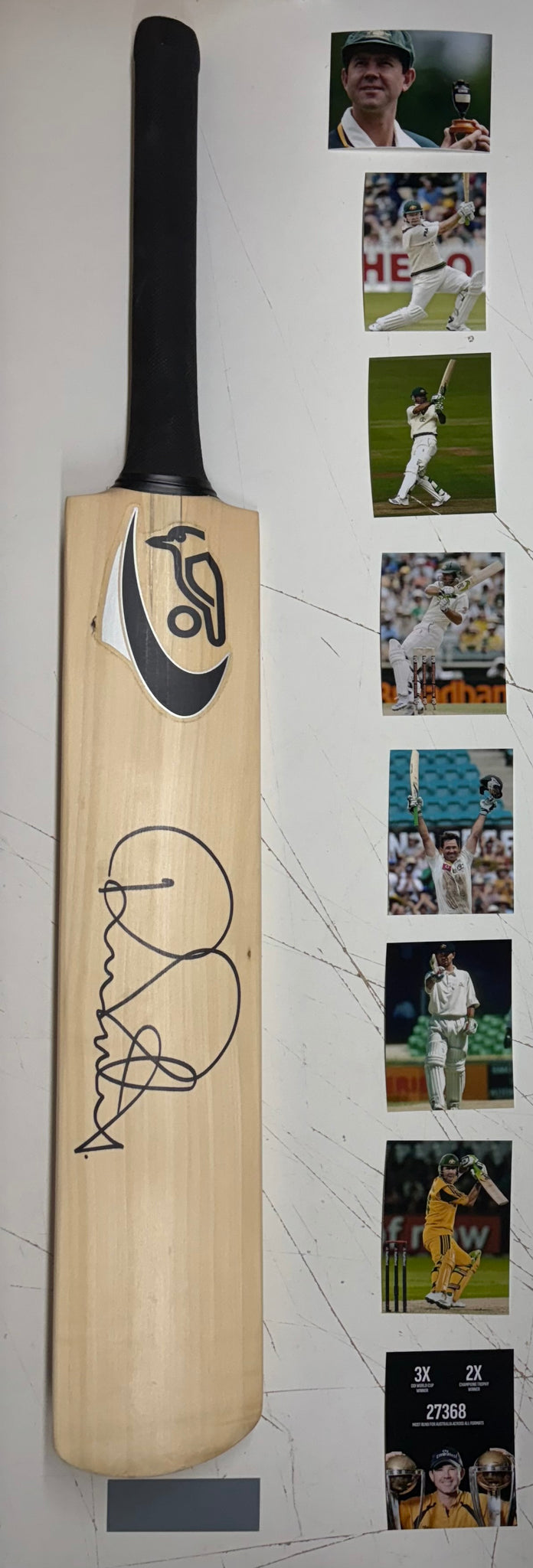 RICKY PONTING Signed full-size Kookaburra Cricket Bat & 3”x5” Photo Collage Display, Box Framed.