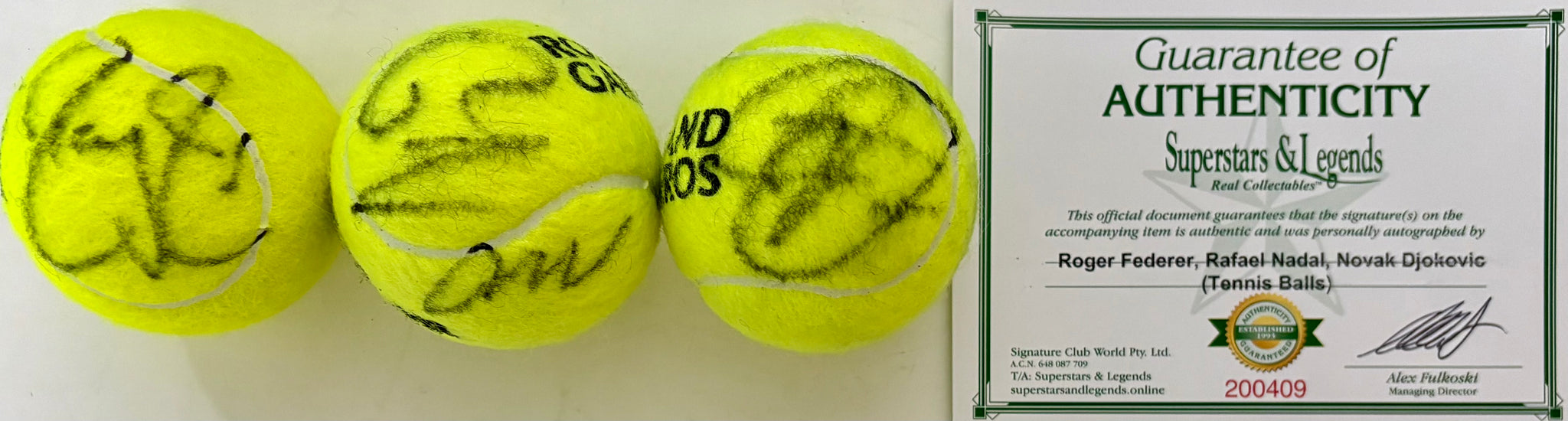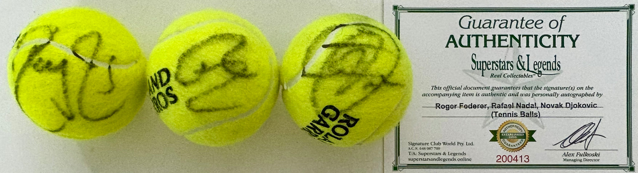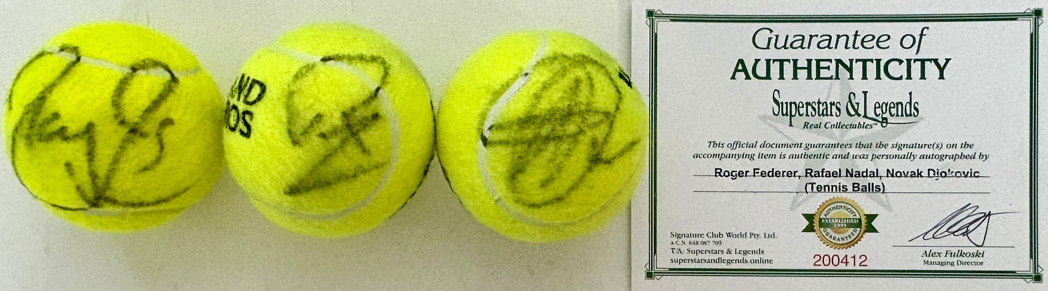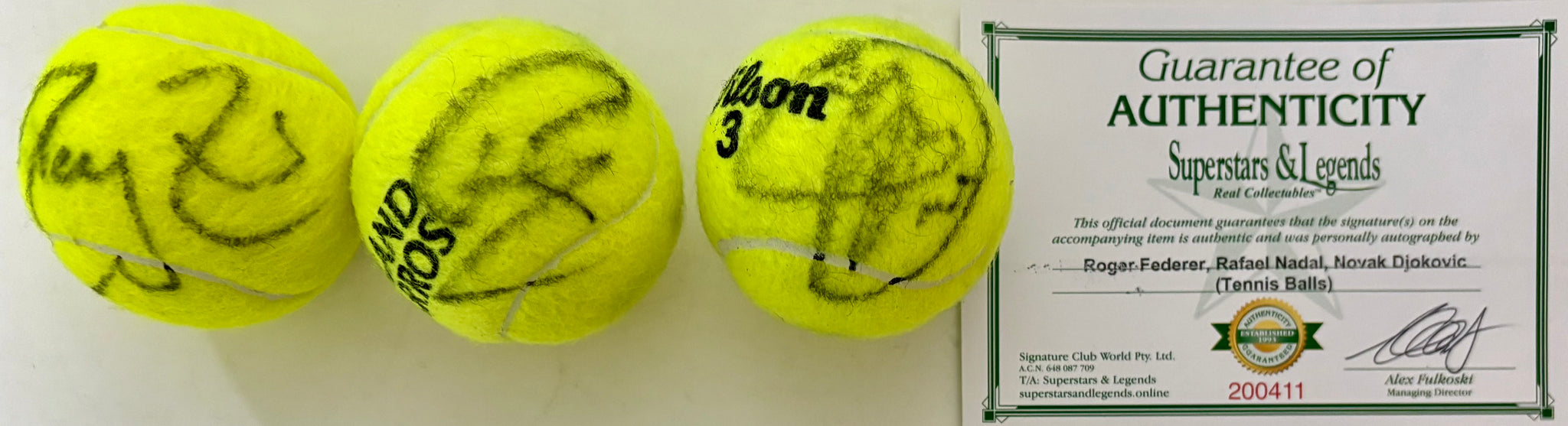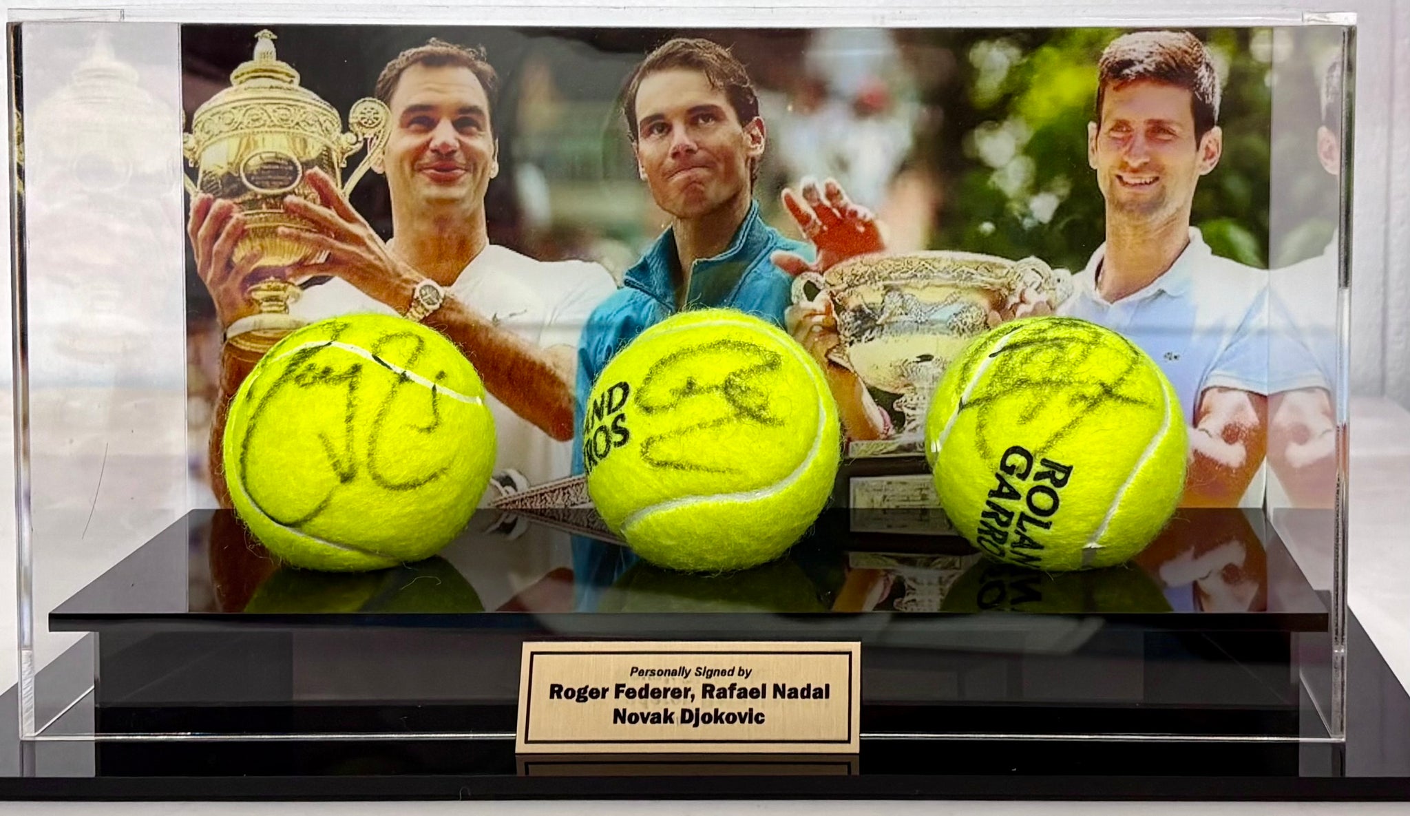 ROGER FEDERER, RAFAEL NADAL & NOVAK DJOKOVIC Signed Tennis Balls in Display Box