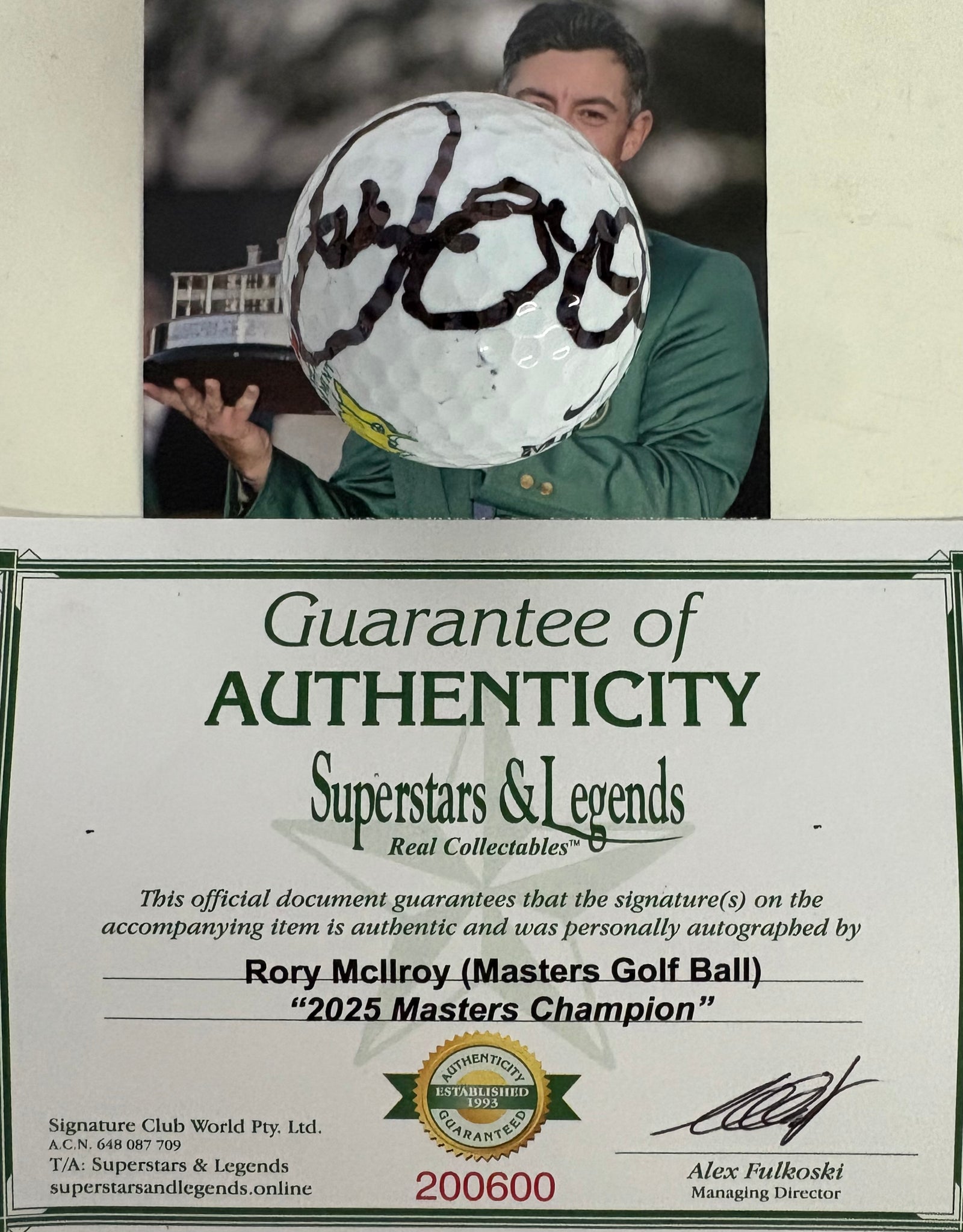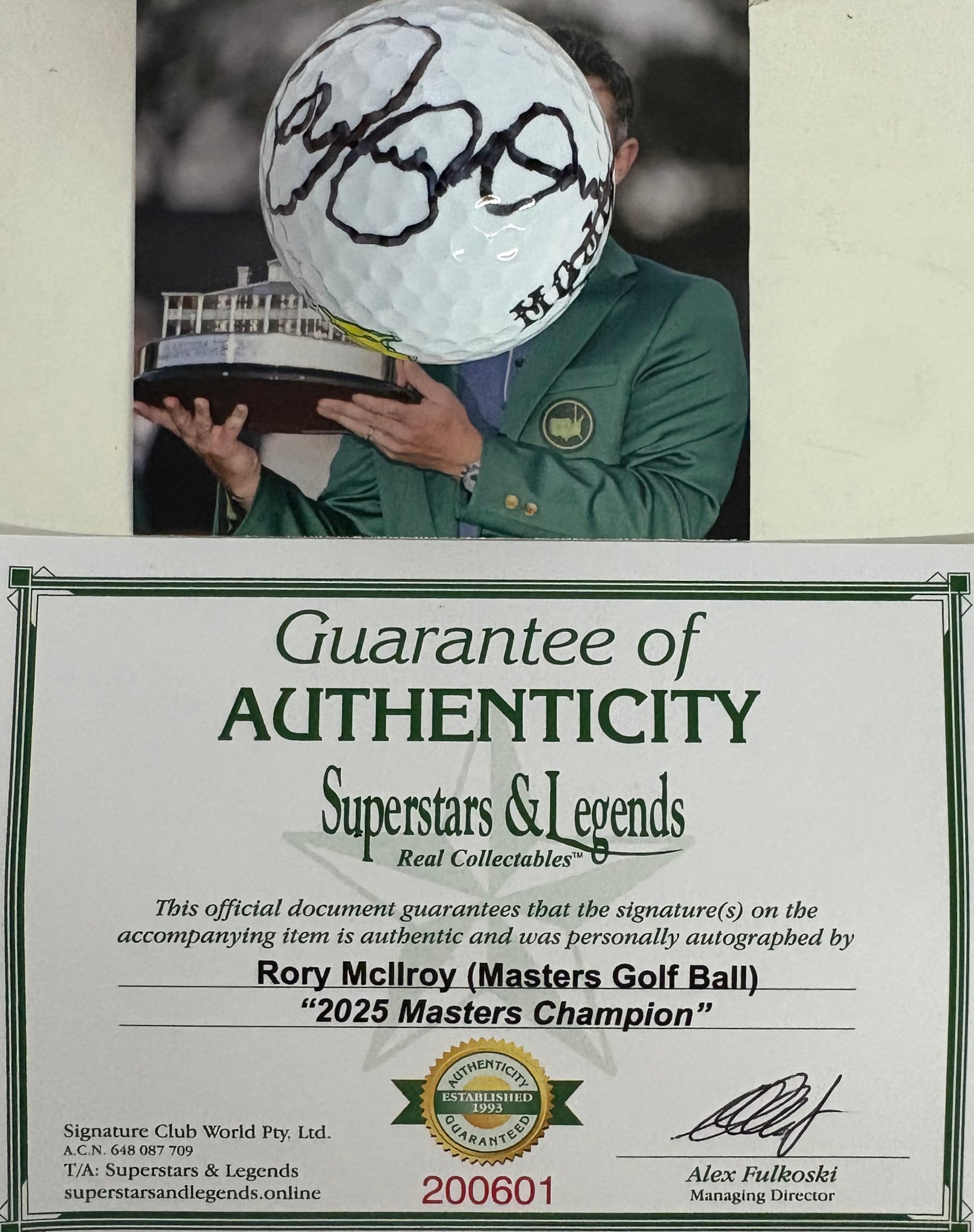 RORY McILROY “2025 Masters Champion” Signed Masters Golf Ball, in Acrylic Display Box.