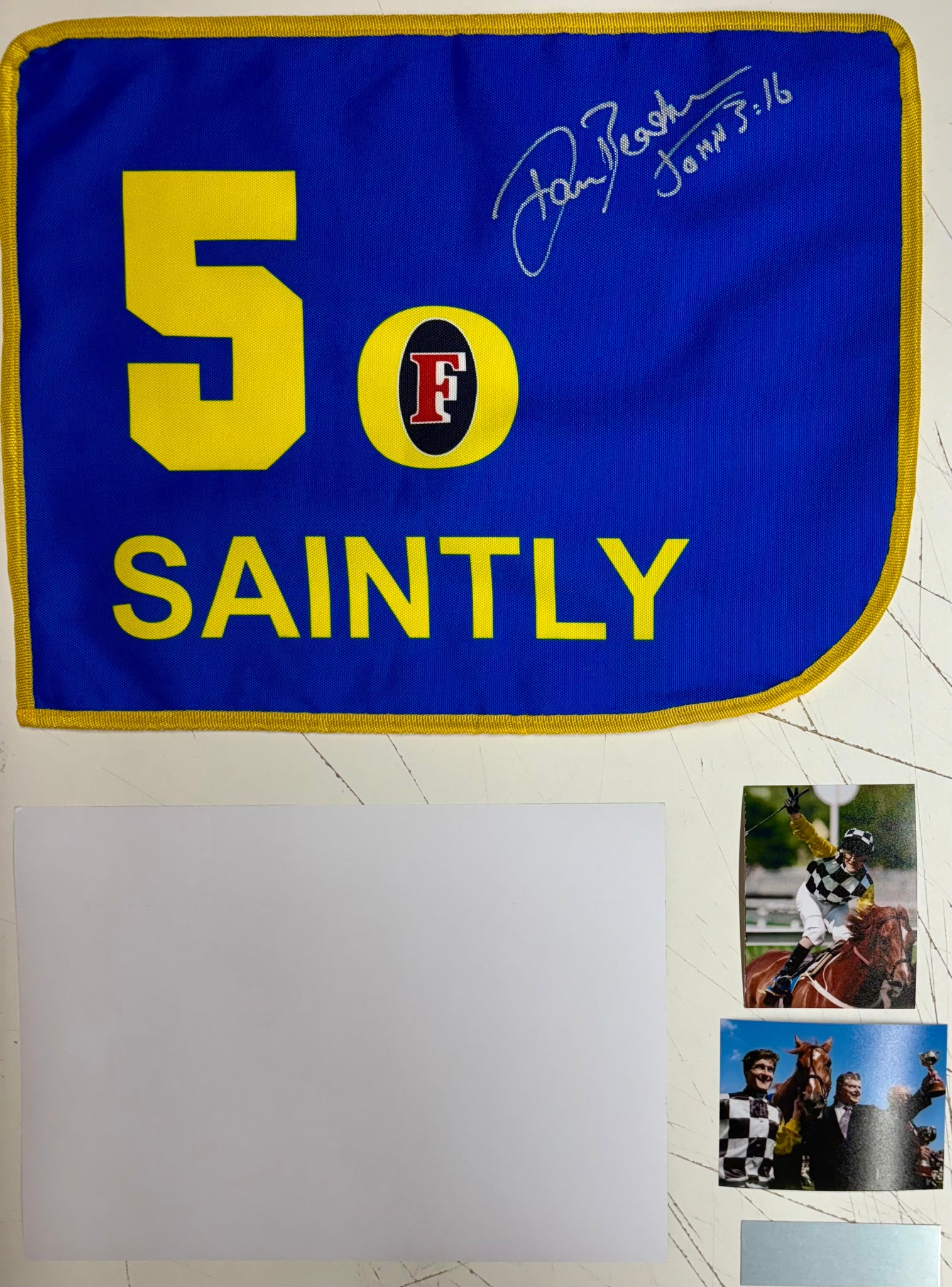 SAINTLY - Darren Beadman (Jockey) Signed Saddle Cloth (replica) & Melbourne Cup Photo Collage Display, Framed.