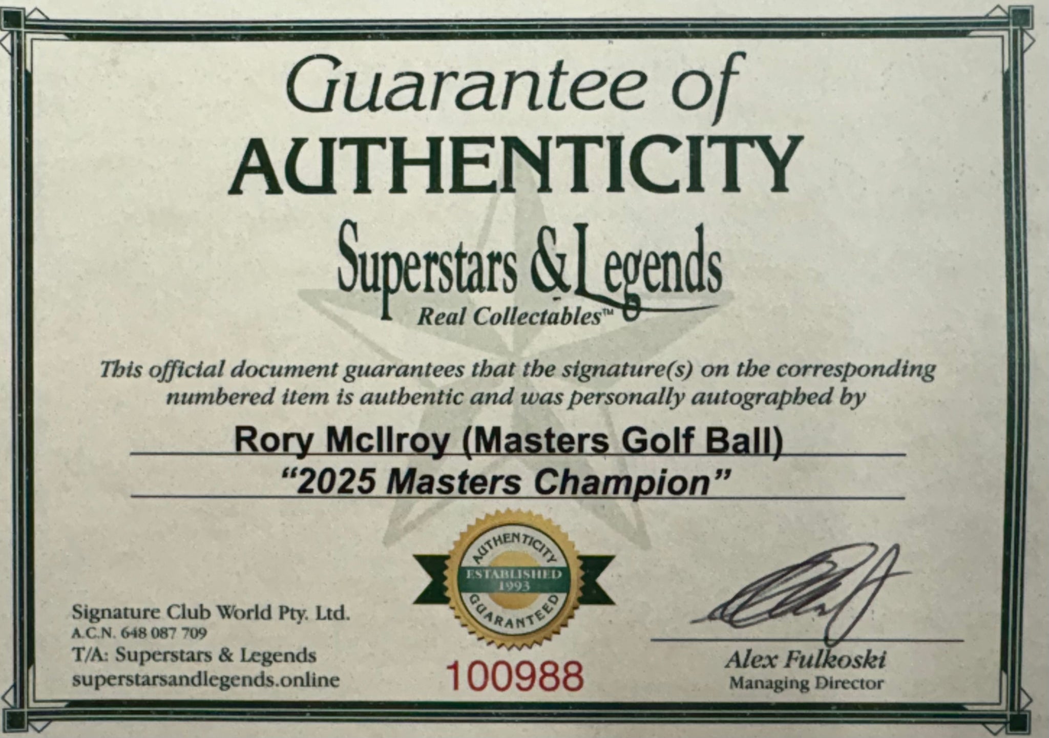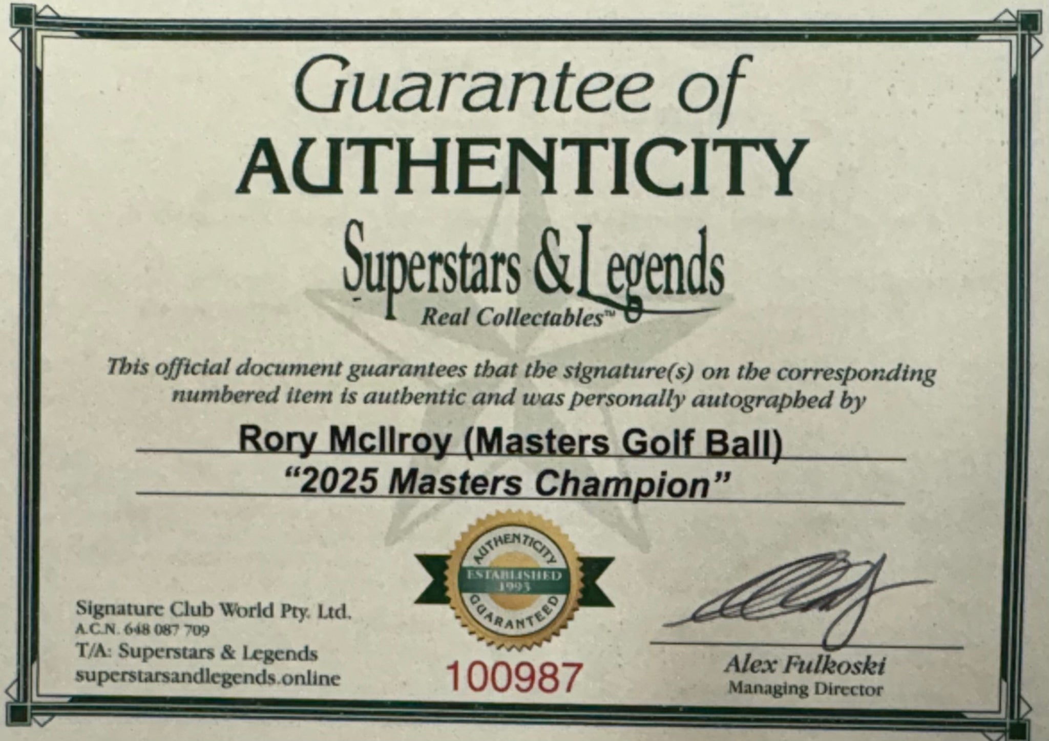 RORY McILROY “2025 Masters Champion” Signed Masters Golf Ball, 2025 Masters Pin Flag & Photo Collage Display, Box Framed.