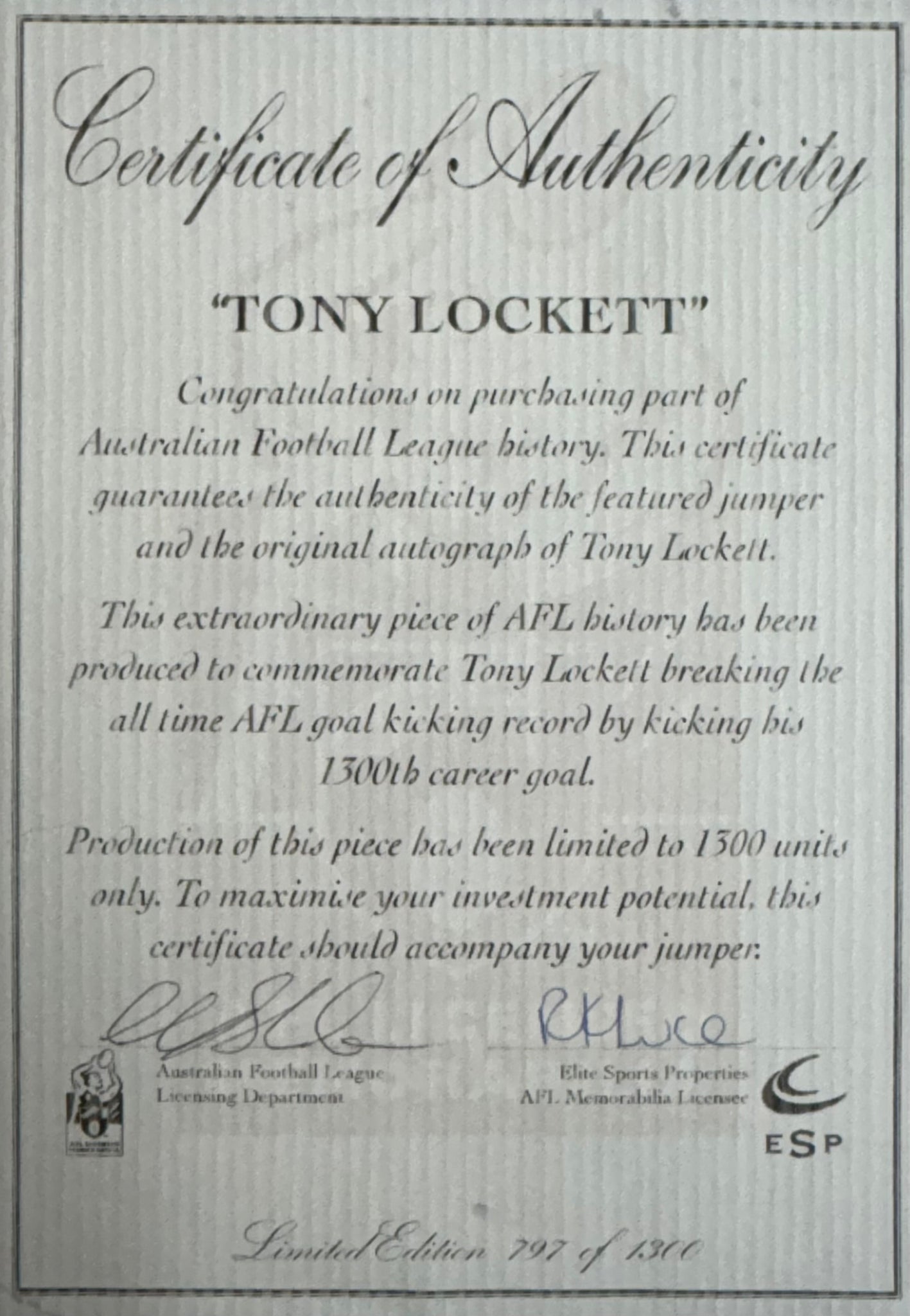 TONY LOCKETT “The Record” Signed Official AFL 1300 Goals Limited Edition (#797/1300) Jumper/Guernsey Display, Framed.