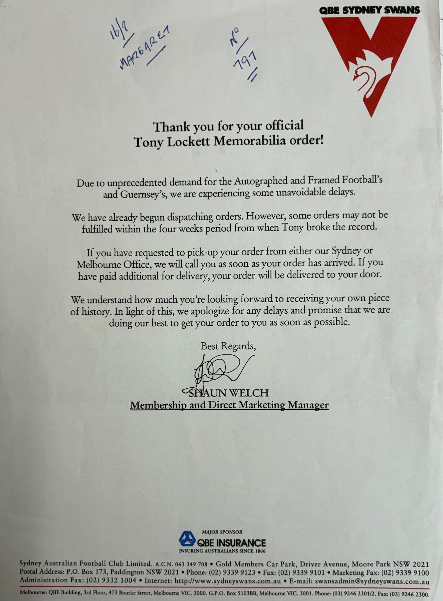 Magnificent display comes personally signed by Tony Lockett. Strictly limited to 1300 editions worldwide.