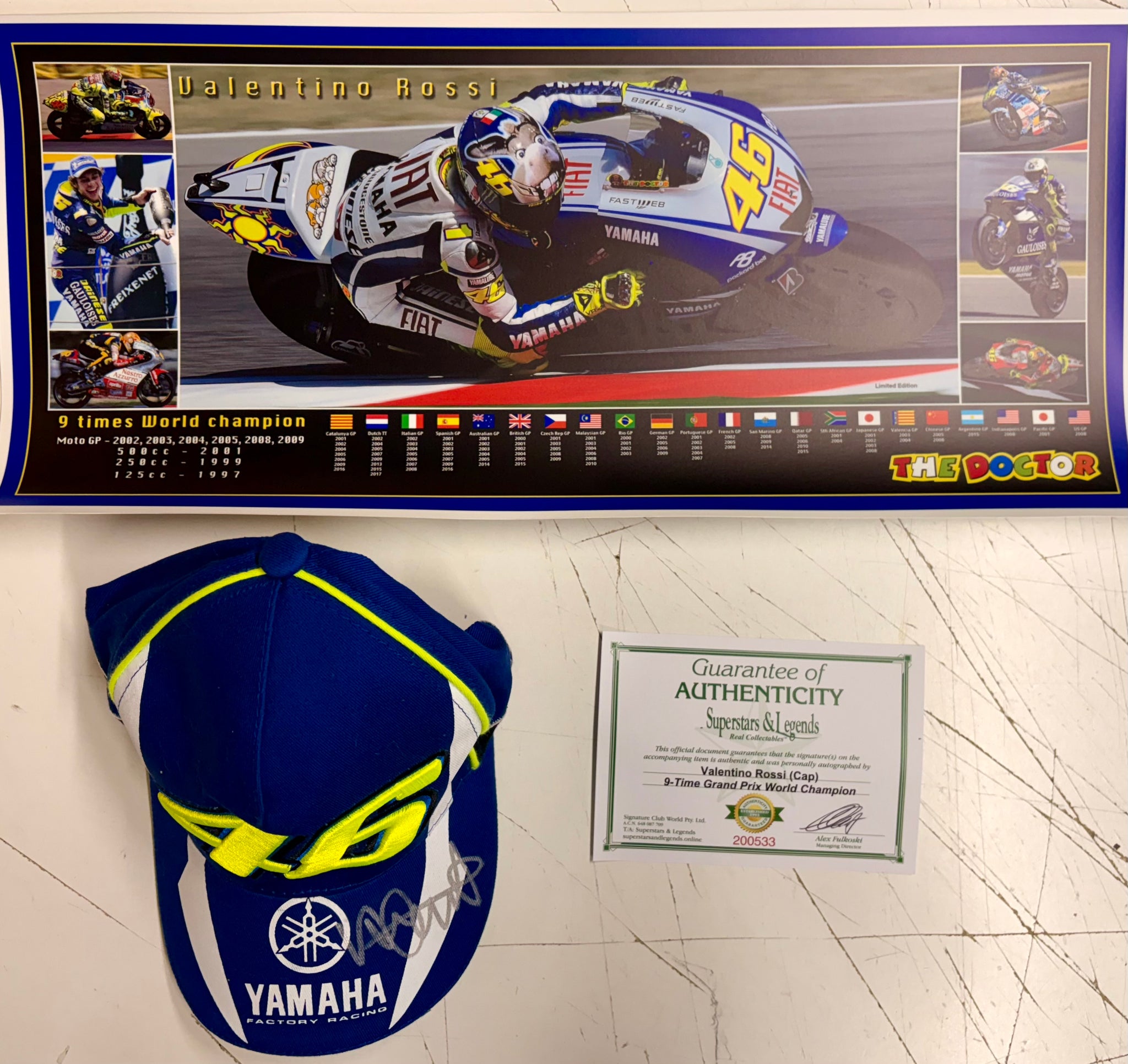 VALENTINO ROSSI "7-Time MotoGP World Champion" Signed Cap (Michelin or Monster) & Limited Edition Career Panoramic Print, UnFramed.